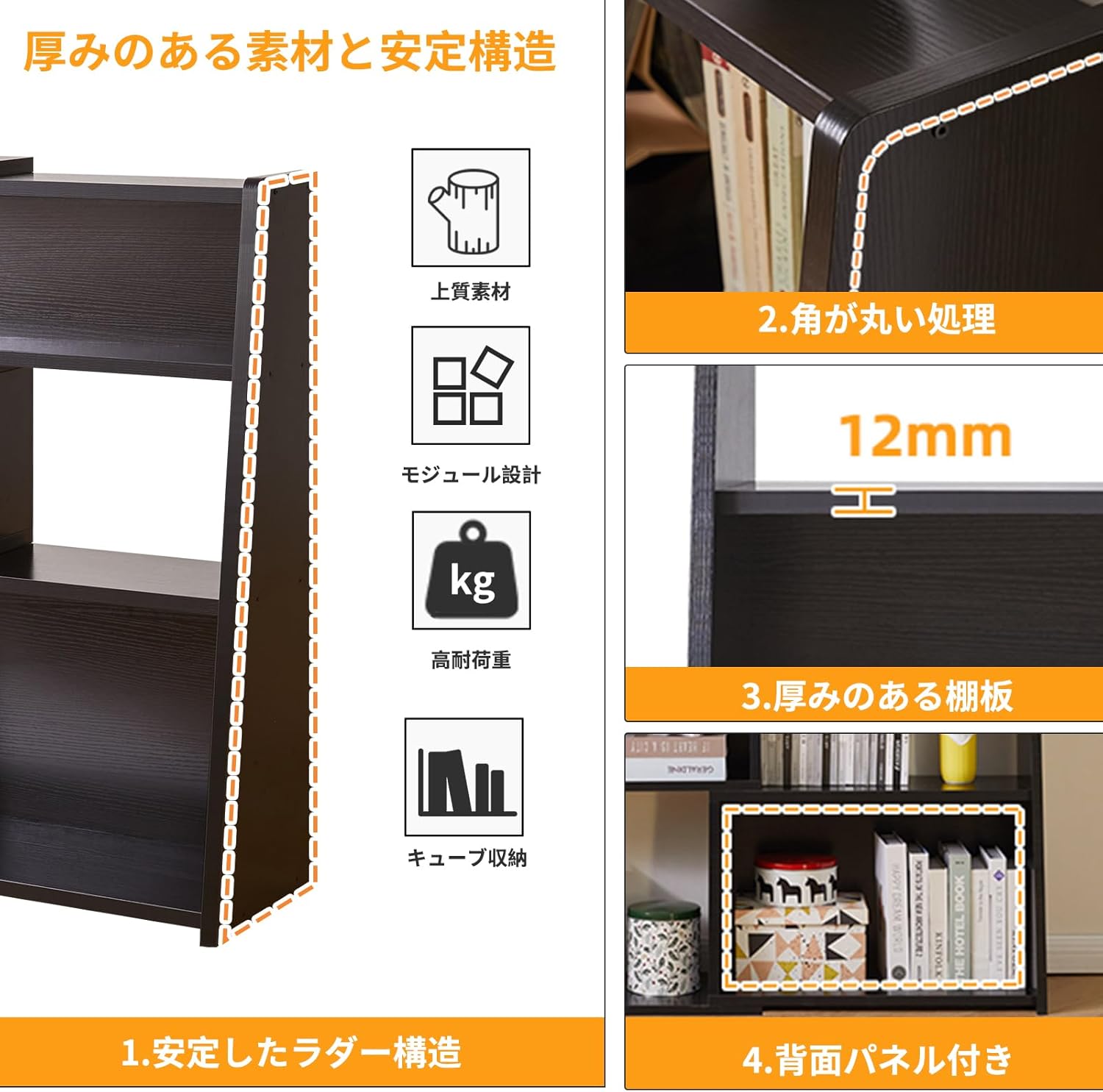 - 安定構造:厚肉複合木材の板製で高い耐荷重性能を実現し、ラダー型構造デザインにより低背本棚の安全性と安定性を確保