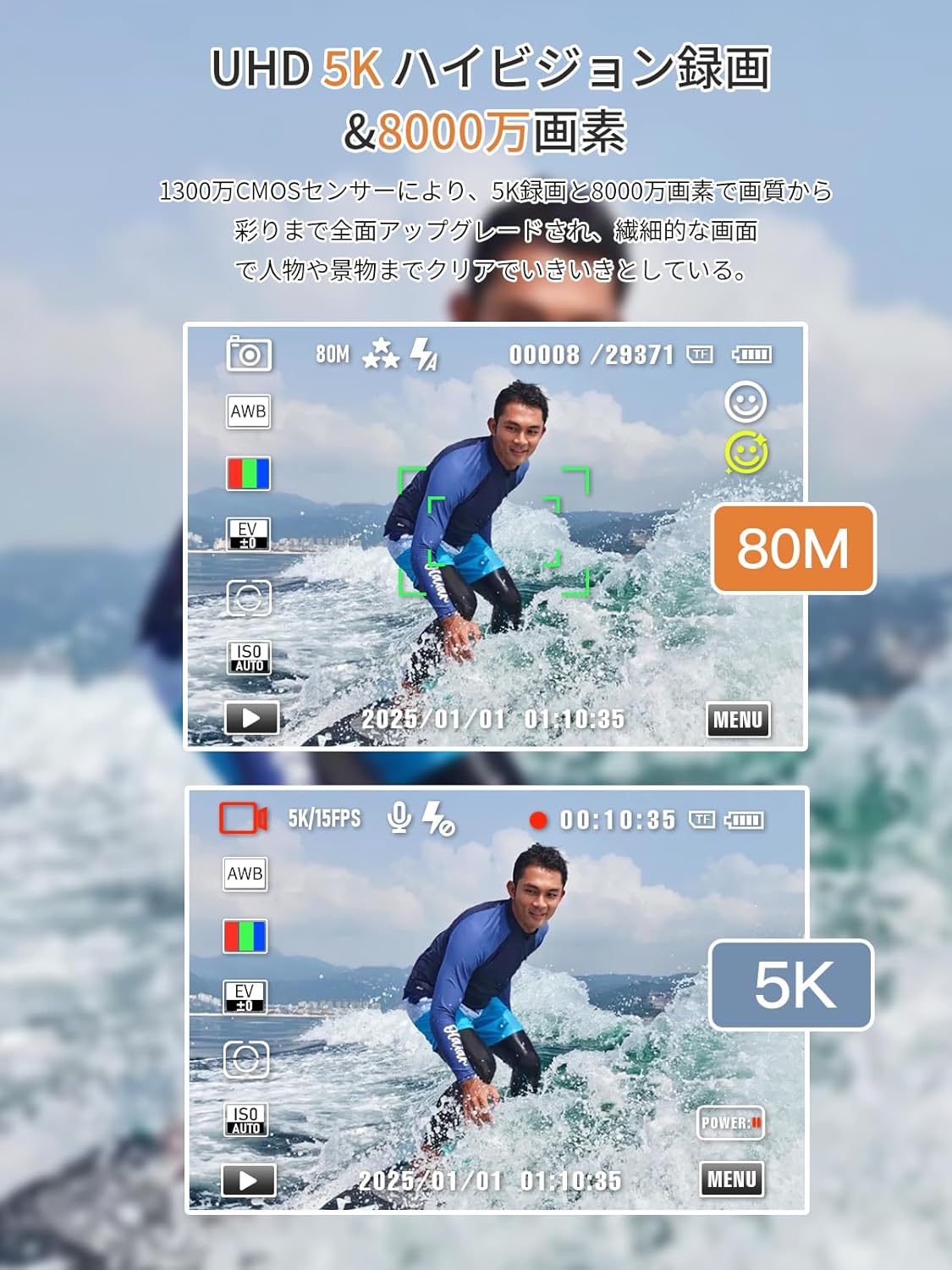 8000万画素という高画素も注目すべき点です。競合製品の多くは1,600万画素から2,000万画素程度であり、画素数の面では圧倒的に優位です。ただし、画素数が高いからといって必ずしも画質が良いわけではなく、センサーサイズやレンズの品質も重要な要素です。小型センサーで高画素化すると、ノイズが増える可能性もあるため、実際の画質は使用環境や撮影条件に左右されます。
