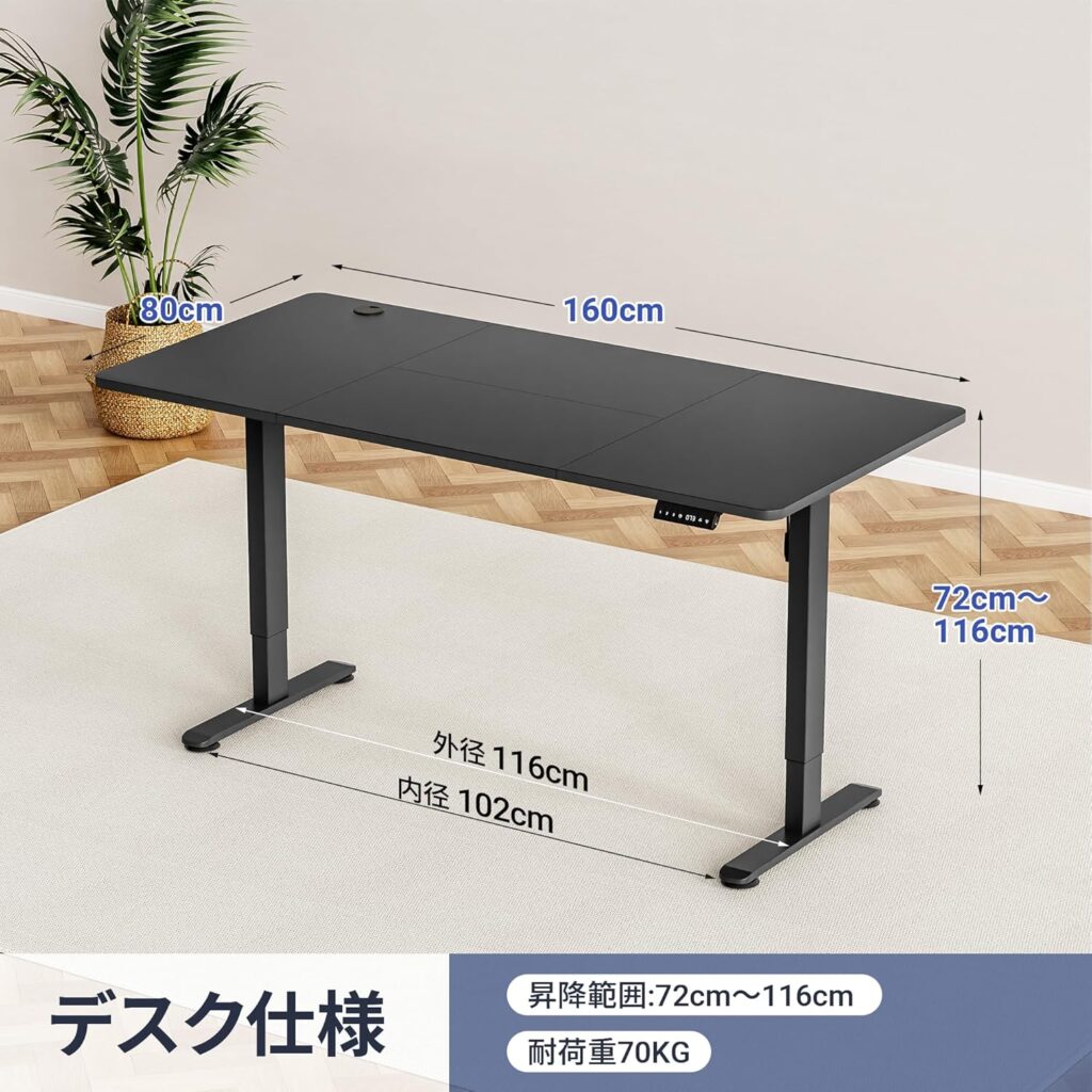 今回レビューするAlebert J-HAD23-0193は、幅160cm × 奥行き80cmという広大な作業スペースを誇ります。これは、一般的な電動昇降デスクの多くが採用する「幅120cm × 奥行き60cm」という標準的なサイズと比較して、圧倒的な広さです。