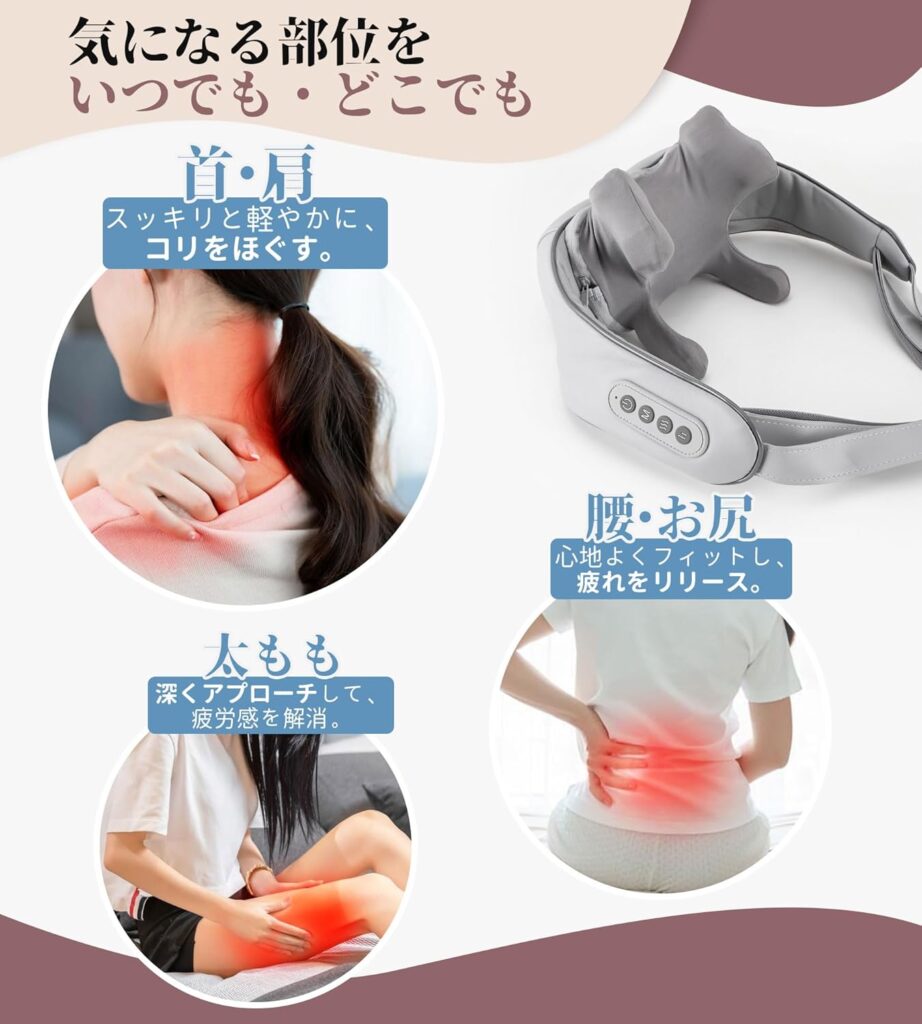 一般的なネックマッサージャーは、大きく分けて「電気刺激(EMS/TENS)」タイプと「揉み玉(もみ玉)機械式」タイプに分かれます。「AJCNSM2405」は後者の「機械式」に分類されますが、特筆すべきは「温熱」と「コードレス」の同時搭載です。
