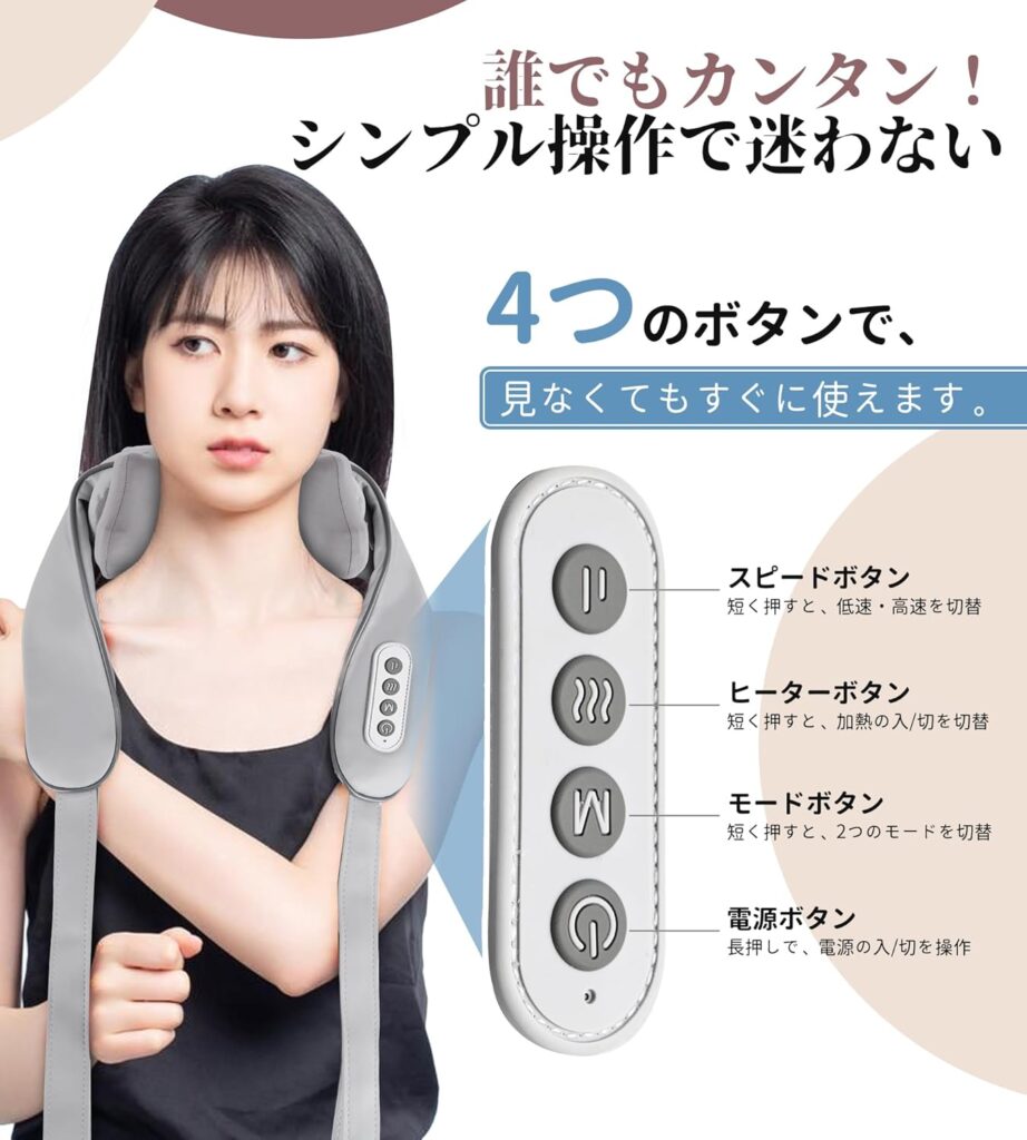- 温熱機能: 多くの競合製品にも温熱機能は搭載されていますが、AJCNSM2405は体感温度の立ち上がりが速く、すぐにリラックス効果を感じやすいというレビューが多く見られます。他社製品の中には、温熱が弱く「気休め程度」と感じられるものもありますが、Alljoyの製品は温かさがしっかりと深部に届く設計となっています。