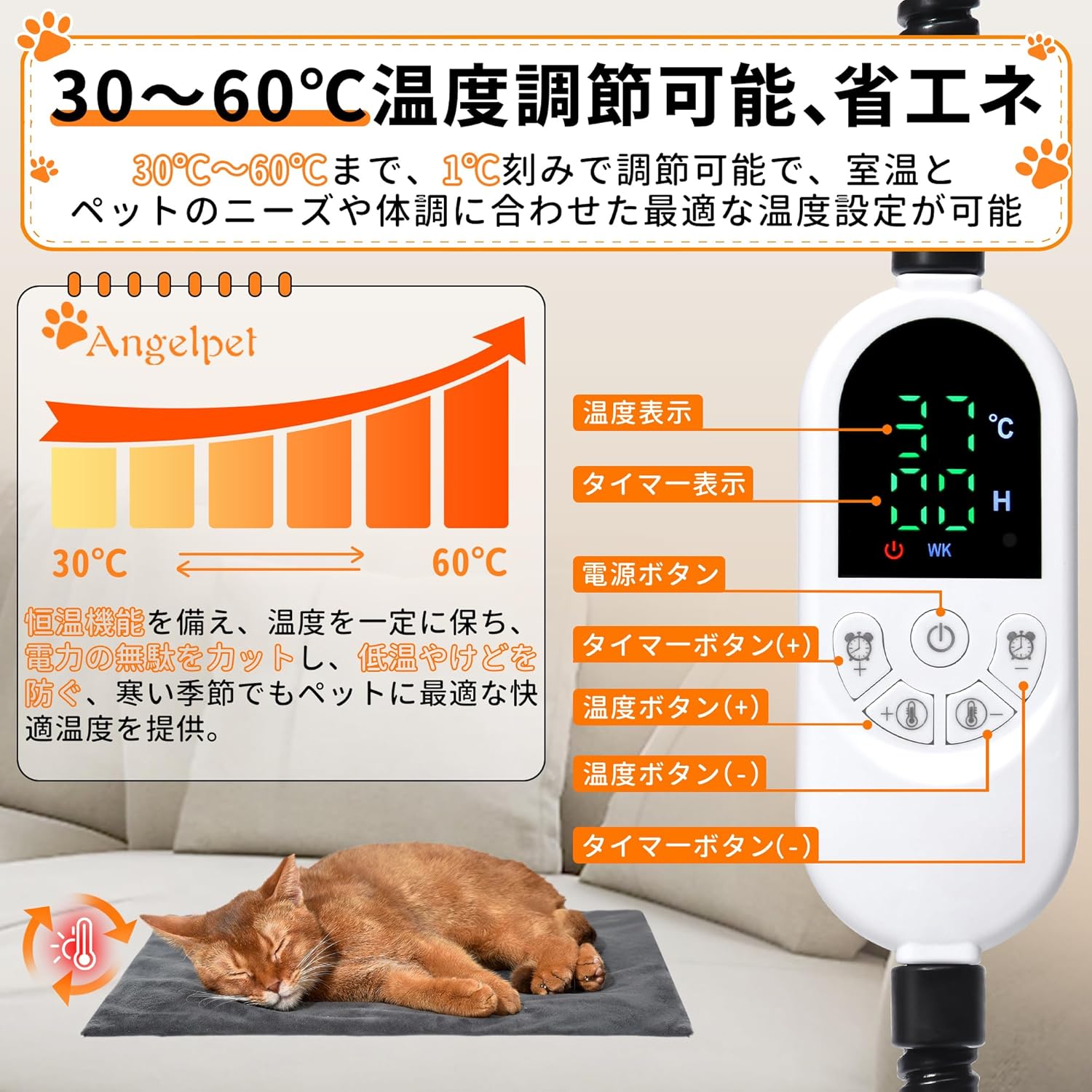 この製品の最大の武器は、30℃から60℃までを「1℃刻み」で細かく制御できる精密さにあります。一般的なペットヒーターは「弱・中・強」の3段階、あるいは5℃刻みであることが多いですが、DRT-4545はまるで高級オーブンのような微調整が可能です。これは、体温調節が苦手な老犬や、特定の温度を好む気難しい猫にとって救いとなります。