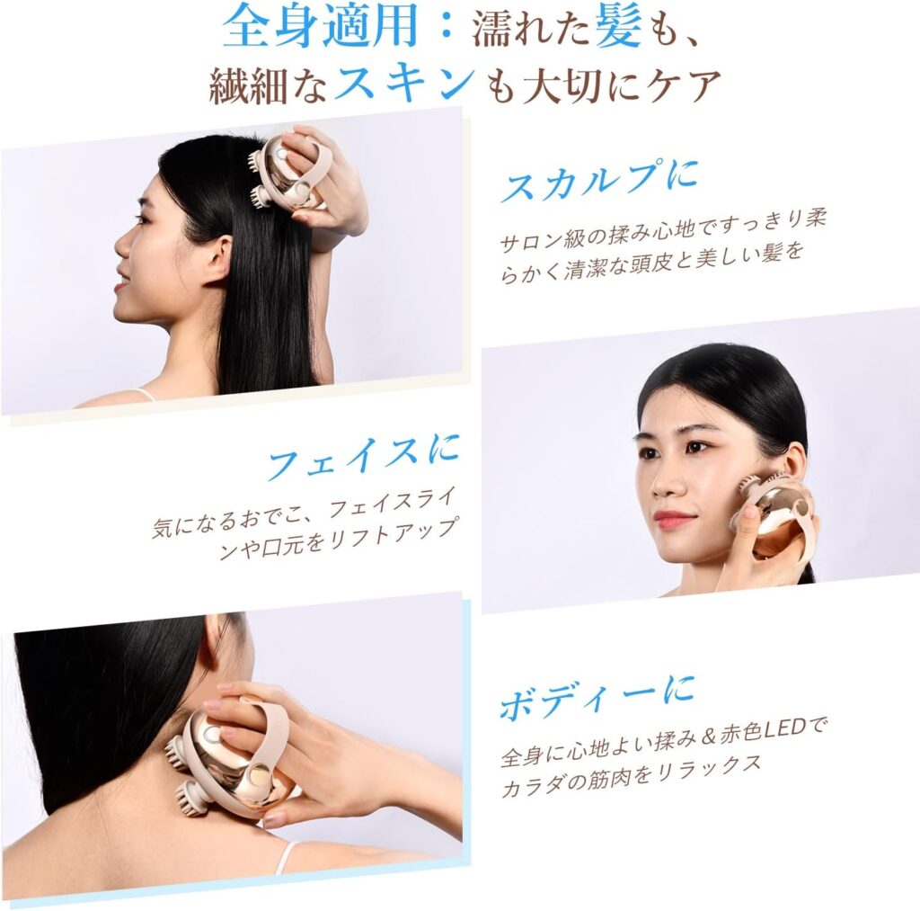 さらに、この一台が活躍する場所は頭皮だけにとどまりません。スペック上の「使用対象:全身」が示す通り、凝り固まった首筋や肩、パンパンに張ったふくらはぎなど、気になる部分をピンポイントでケアできます。バッテリー式でコードレスなため、体のどの部分にもスムーズにアプローチ可能。まさに、あなたのための「専属セラピスト」が、この一台に凝縮されていると言えるでしょう。