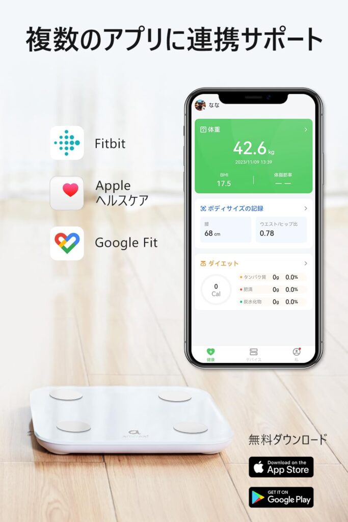 単に「スマホと繋がる」だけではありません。CS20Mの真価は、Google Fit、Fitbit、Appleヘルスケアという**「三大健康プラットフォーム」すべてとシームレスに連携できる点**にあります。これにより、体重計独自のアプリにデータを閉じ込めることなく、あなたが普段愛用しているスマートウォッチや健康アプリの中に、体重データを自動で統合できます。「測る」という行為が、独立した作業ではなく、生活全体の一部として溶け込む設計になっています。