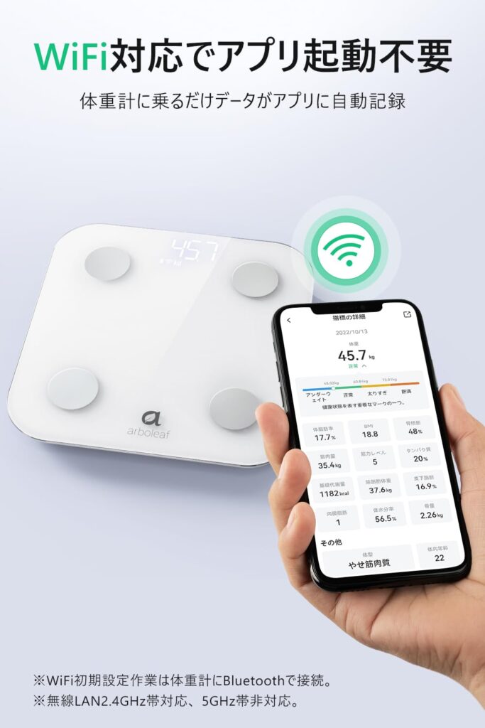 多くの格安モデルがBluetoothのみの対応である中、この製品はWi-Fi接続にも対応している点が決定的な強みです。Bluetoothはスマホが近くにないと同期しませんが、Wi-Fiならスマホが手元になくても、乗るだけでクラウド経由でデータが記録されます。お風呂上がりに裸でスマホを探す必要はありません。この「無意識の記録」こそが、継続の最大の秘訣です。