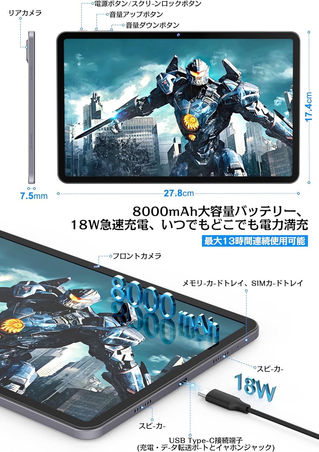 • 充電速度: Headwolfの「HPad」シリーズなどは、30W以上の急速充電に対応しているモデルが多く、短時間でバッテリーを回復できます。対するArieskingなどの一般的な格安タブレットは、10W〜18W程度の充電速度であることが多く、満充電までに時間がかかる傾向があります。