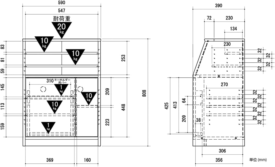 - 耐荷重: 天板20kg、棚板10kg、キーホルダー用バー1kg、扉裏収納1kg
