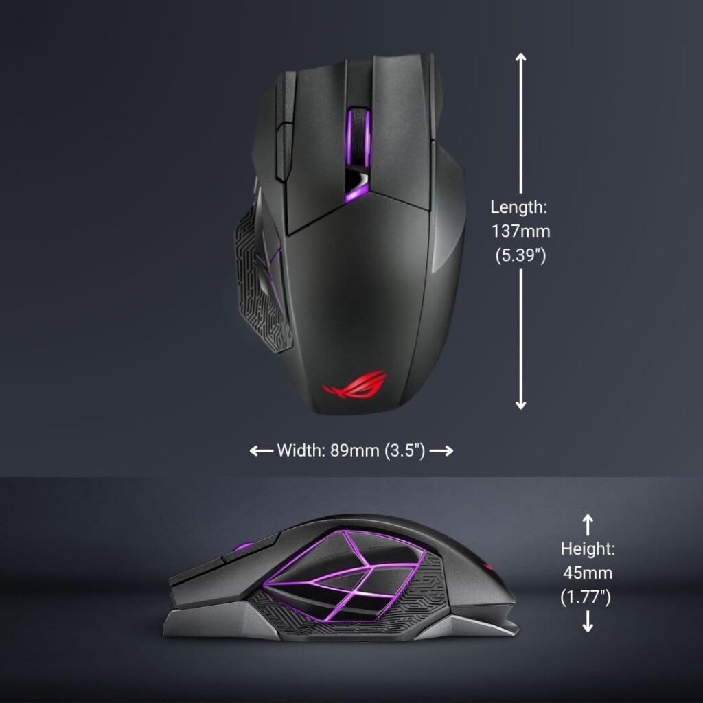 さらに、サイドの6つのボタン配置が、一般的な多ボタンマウスのように単にボタンを並べたものではなく、ROGのロゴマークをモチーフにした立体的で独特なレイアウトになっています。これにより、ユーザーは視覚的に確認することなく、親指の感覚だけでどのボタンを押しているかを瞬時に把握できるため、MMORPGやMOBAといった複雑なスキル操作が求められるゲームにおいて、思考の速度でスキルを発動できるようになります。その結果、反応速度が問われる場面での一瞬の判断ミスを防ぎ、勝利を掴むための決定的なアドバンテージを与えてくれます。重量級のボディ(スペック上の重量は861.83gとなっていますが、これはパッケージ総重量と推測され、本体重量は168g程度が実測値です)も、手のひらに重厚な安定感をもたらし、精密なトラッキングを求めるゲーマーには逆にメリットとなる場合があります。