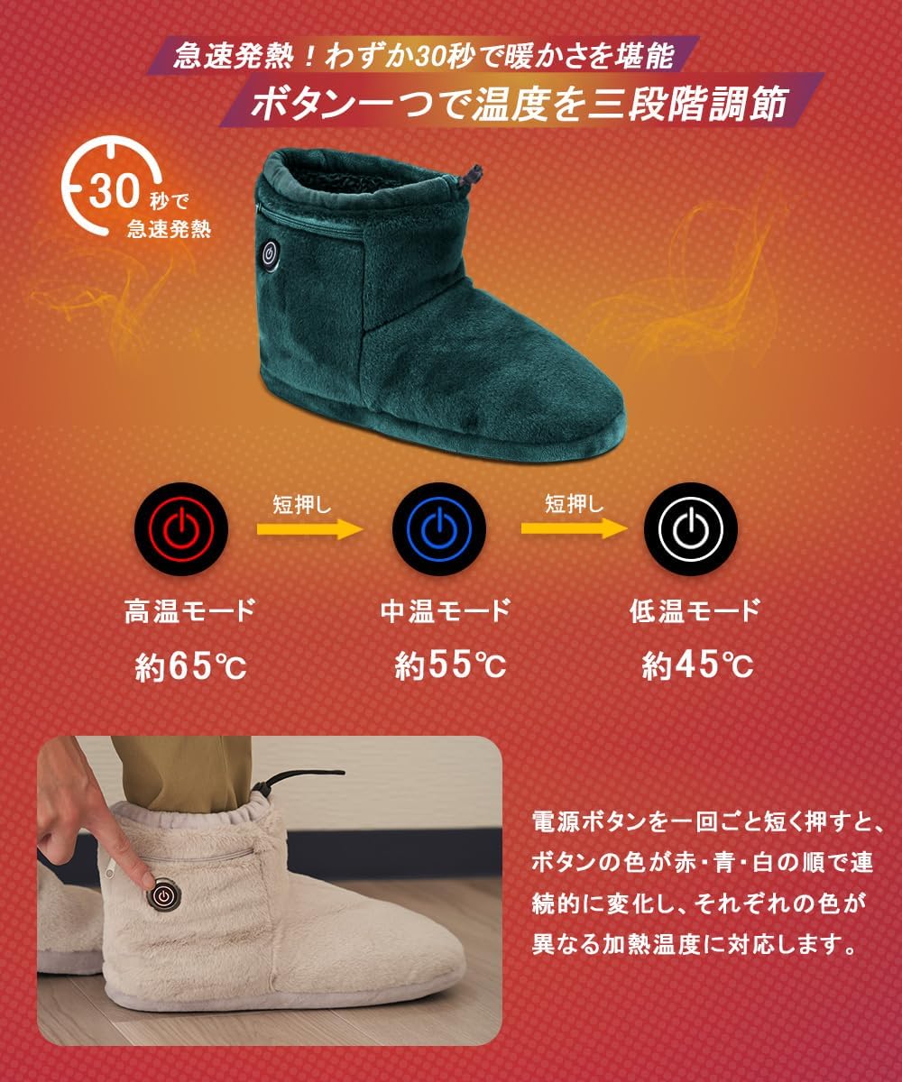 - 【両面急速発熱&3段階温度調節】本フットウォーマーは高品質日本製繊維ヒーターを採用し、発熱が早く均等に温かさが広がります。足の甲・足裏の2箇所に広範囲電熱ヒーターを配置し、スイッチオンからあっという間にぽかぽかになり、寒さの厳しい日にもすぐに足を温められます。環境温度や自身ニーズに合わせて、温度を45℃から65℃までに細かく調整でき、ボタンの色で温度段階が一目瞭然で分かりやすいです。