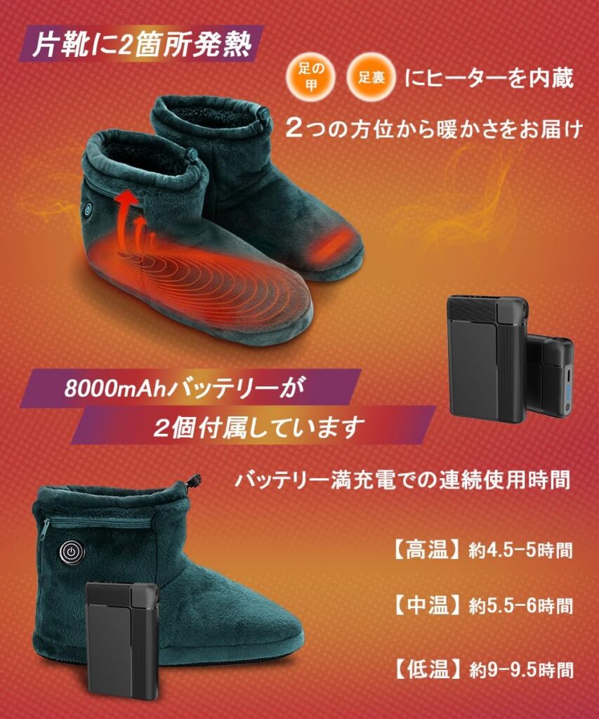 - 【8000mAhバッテリー付き&省エネ】日本のPSE認証を取得した大容量バッテリーが2つ搭載されています。充電用二股ケーブルを採用し、2台のバッテリーを同時に充電できます。消費電力は約10Wで、 1時間あたりの電気代は僅か0.3~0.5円で、とても省エネでお金の節約になります。男女や年齢を問わずお使える電気スリッパです。ソファでくつろぐとき、勉強やパソコンをしているとき、調理や家事をしているときなど、様々なシーンで大活躍してくれます。