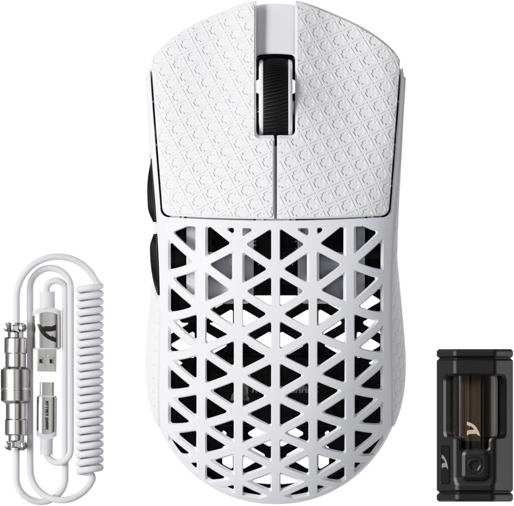 本製品最大の特徴は、カーボンファイバー素材を採用したことによる、圧倒的な軽さと丈夫さです。一般的なプラスチック製マウスとは一線を画す素材選びにより、激しいマウス操作でも歪まない剛性を確保しつつ、まるで空気を持っているかのような操作感を実現しています。長時間のエイム練習でもパフォーマンスを維持できるでしょう。