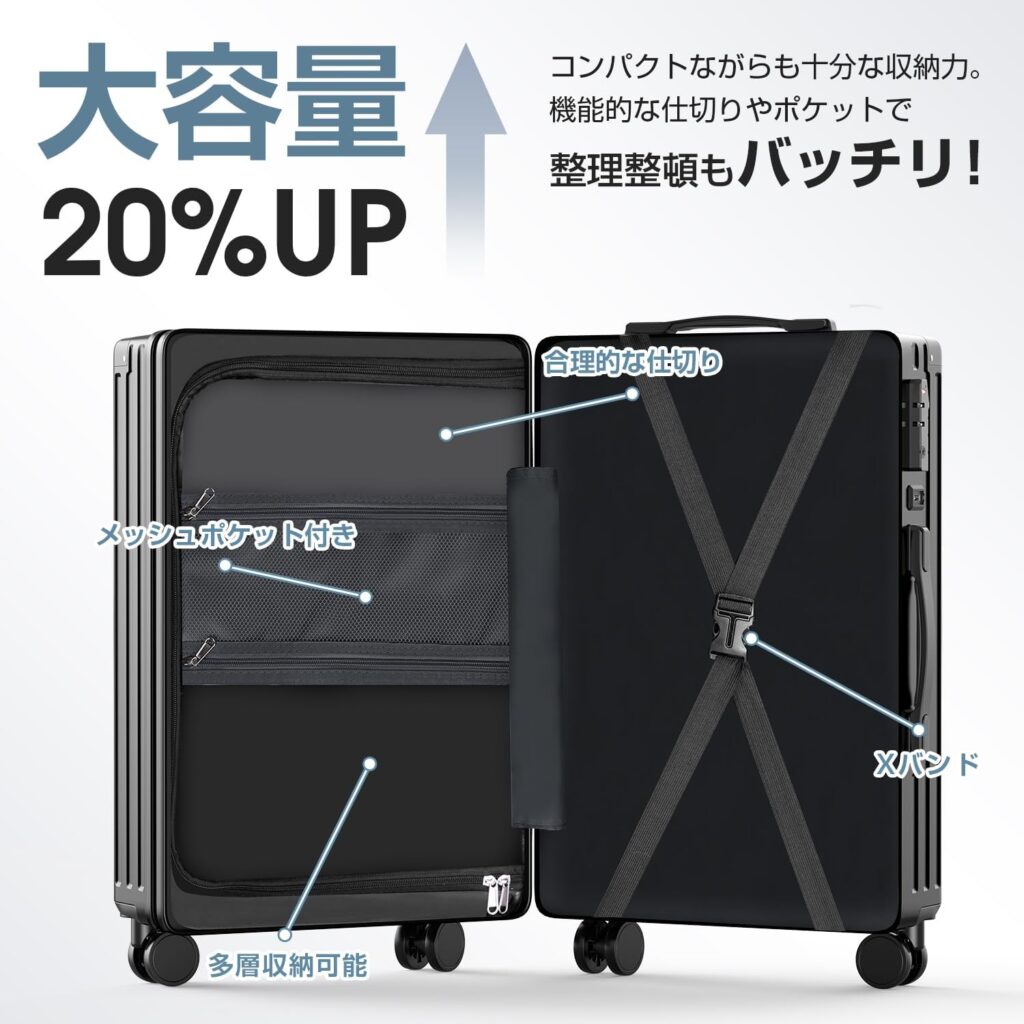 軽量化の代償として、外装シェルが柔らかく、強い衝撃を受けた際に凹みやすいという特性があります。預け入れ荷物として手荒に扱われた場合、高価格帯のポリカーボネート100%製品ほどの復元力や耐衝撃性は期待できません。また、内部のジッパーや縫製の細部を観察すると、糸の処理が甘い箇所が散見されるなど、職人による工芸品的な品質を求める方には不向きです。あくまで「消耗品として割り切って使い倒す」というスタンスが求められる製品です。