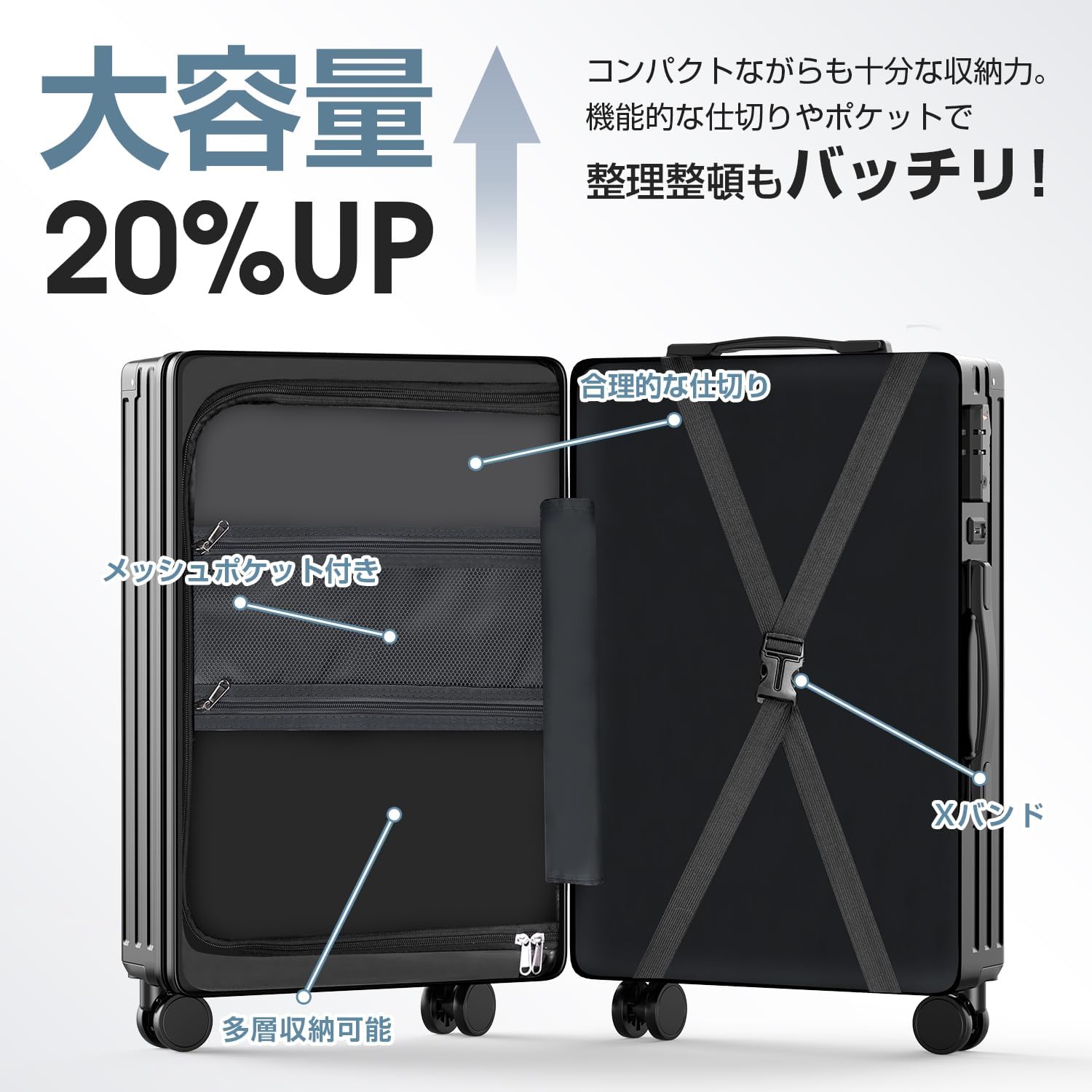 このモデルの最大の武器は、2.4kgという圧倒的な軽さです。一般的な機内持ち込みサイズのスーツケースが3kg前後であることを考えると、この「0.6kgの差」は、お土産を一つ多く詰め込める余裕を生み出します。さらに、33 x 22 x 54 cmというサイズ設計は、厳格なLCCの規定をクリアしつつ、容量を最大化するための絶妙なバランスを保っています。ダブルキャスターを採用しているため、石畳や凹凸のある路面でも安定した走行が可能であり、低価格モデルにありがちな「真っ直ぐ進まない」というストレスを軽減している点も評価できます。