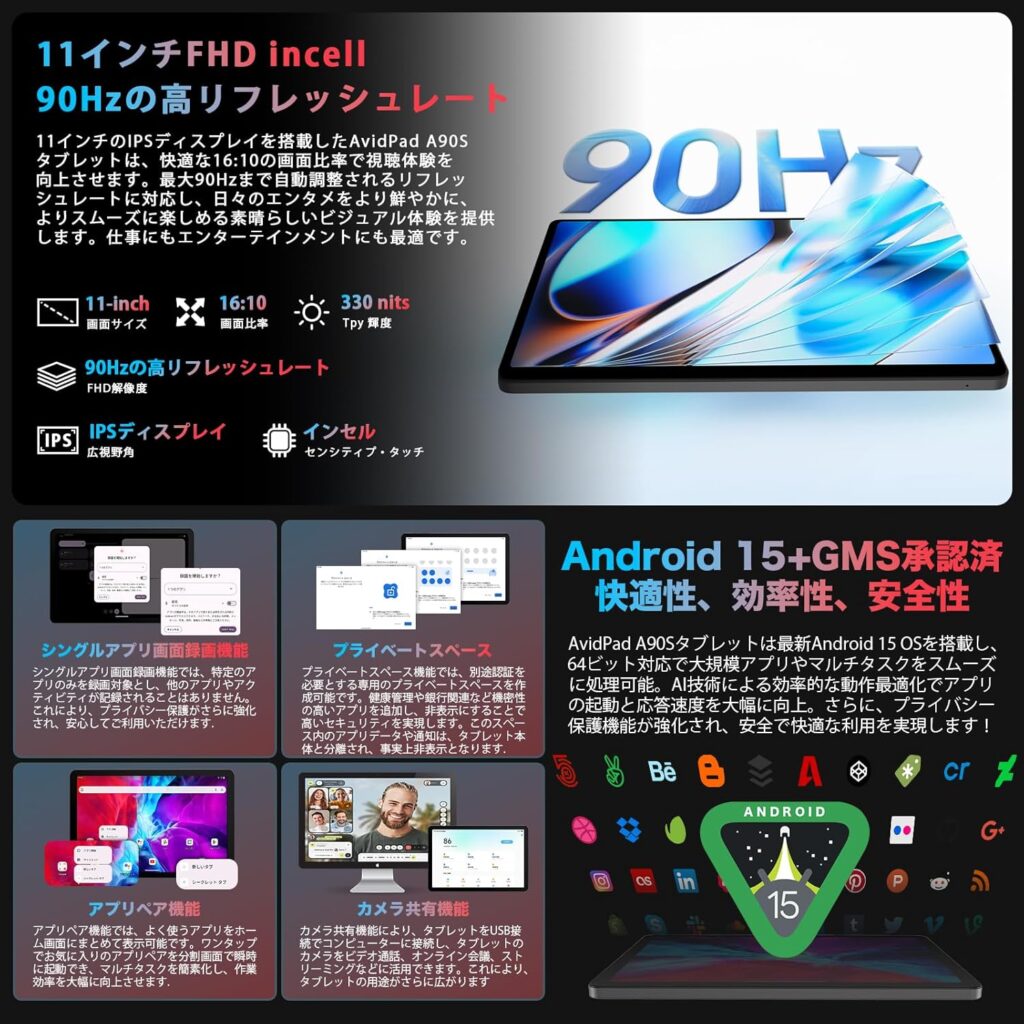 - ディスプレイ: 3モデルともに約11インチ、解像度1920×1200ピクセルと、画面サイズと精細さではほぼ互角です。しかし、重要な違いがリフレッシュレートにあります。AvidPad A90SとGalaxy Tab A9+は90Hzのリフレッシュレートに対応しており、Webサイトなどをスクロールする際の表示が非常に滑らかです。一方、Lenovo Tab M11は標準的な60Hzのため、この点で一歩劣ります。