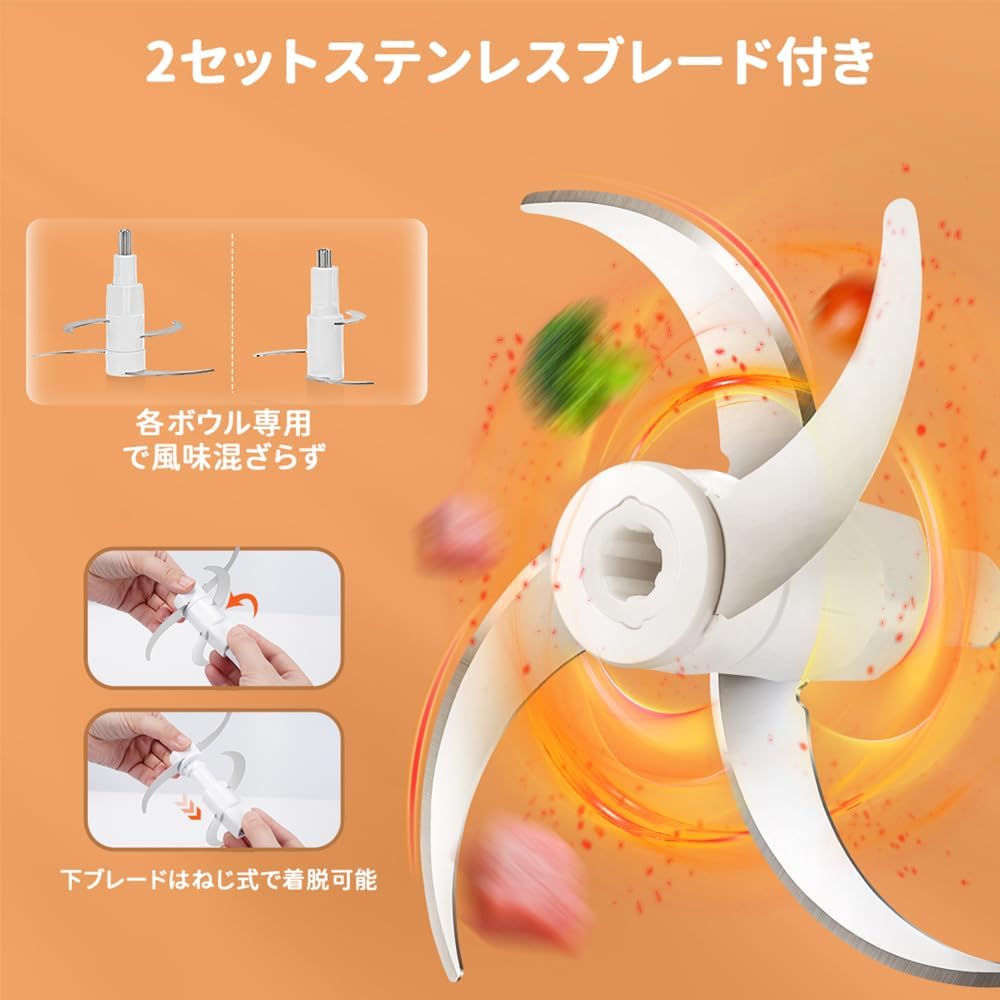 - 2種のボウルがもたらす「効率」と「衛生」: ガラスとステンレス、素材の異なる2つの大容量ボウルが付属する点は、他社製品にはない大きな特色です。例えば、肉や魚など匂いや油分が気になる食材はステンレスボウルで、サラダ用の野菜など色移りを確認しながら刻みたいものはガラスボウルで、といった使い分けが可能です。これにより、調理の途中でいちいちボウルを洗う手間が省け、作業効率が格段に向上します。