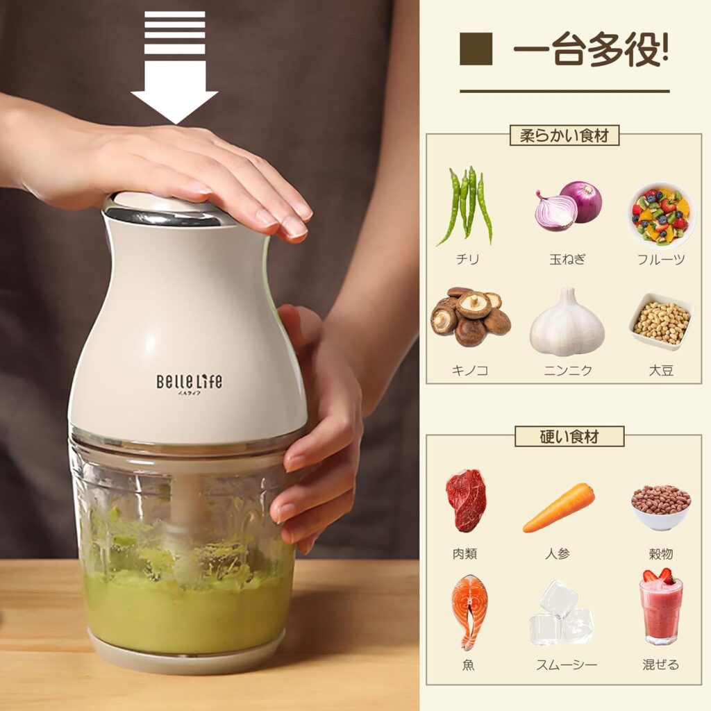 一方、BelleLife BLF-B02U2は、固い食材を粉砕したり、みじん切りにしたりする用途に特化しており、用途が大きく異なります。