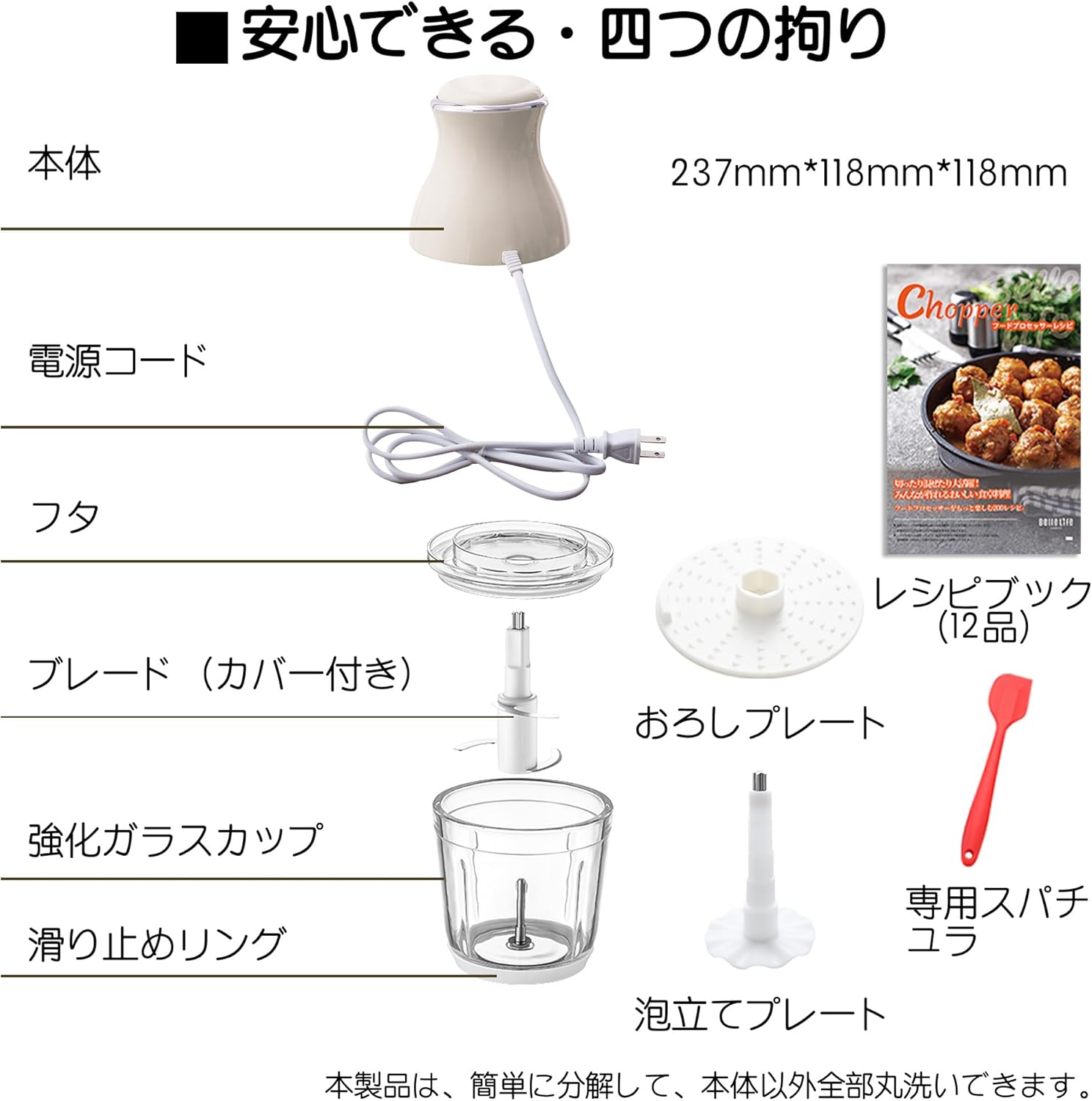 刻む・混ぜる・練る・潰す・砕く・おろす・泡立てるという7つの機能を、これ一台で網羅しており、個別に調理家電を買いそろえる必要がありません。