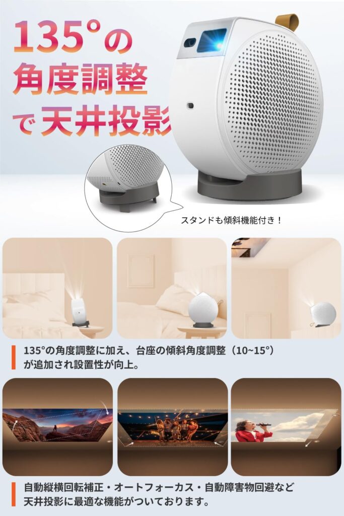 口コミでも絶賛されているのが、付属の台座による135度の角度調整機能です。これにより、壁だけでなく天井への投影が驚くほど簡単に行えます。ベッドに寝転がったまま、天井いっぱいに広がる映画やライブ映像を楽しむ…。これは、ただ映像を大画面で見る以上の、至福のリラックスタイムを演出してくれます。忙しい一日の終わりに、スマホを手放して自分だけの世界に没入できる時間は、何物にも代えがたい価値があるでしょう。