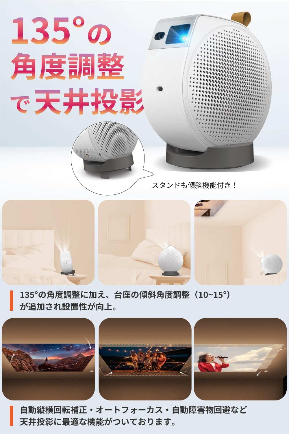 • 台形補正: 自動縦横回転補正、オートフォーカス機能、自動障害物回避機能