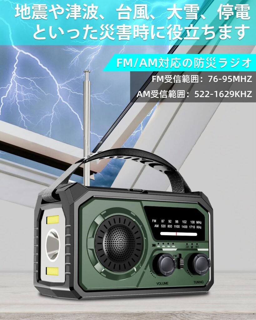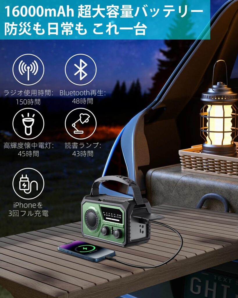 • 付属機能:大容量バッテリー16000mAh、AM/FM受信、3つの点灯モード、Bluetooth接続、SOSアラーム、手回し充電、ソーラー充電、急速充電(5V/3A USB)、モバイルバッテリー機能(スマホ約3回充電可能)、スマホ充電対応、ヘッドホンジャック