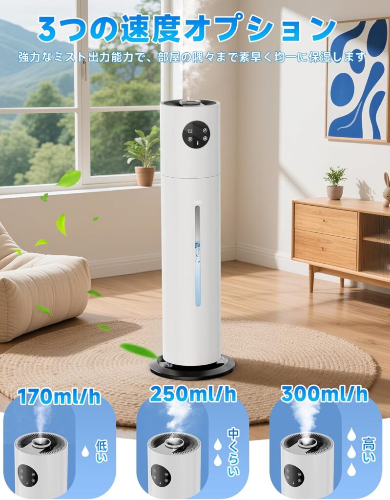 また、スリムなタワー型のデザインは、設置場所を選ばない実用性に繋がります。一般的な床置き型加湿器は意外と場所を取りますが、TJ-T6なら家具の隙間や部屋の隅にすっきりと収まります。さらに、高さがあることで、潤った空気が効率的に部屋全体へと広がり、足元だけが湿っぽくなるという失敗も防ぎます。