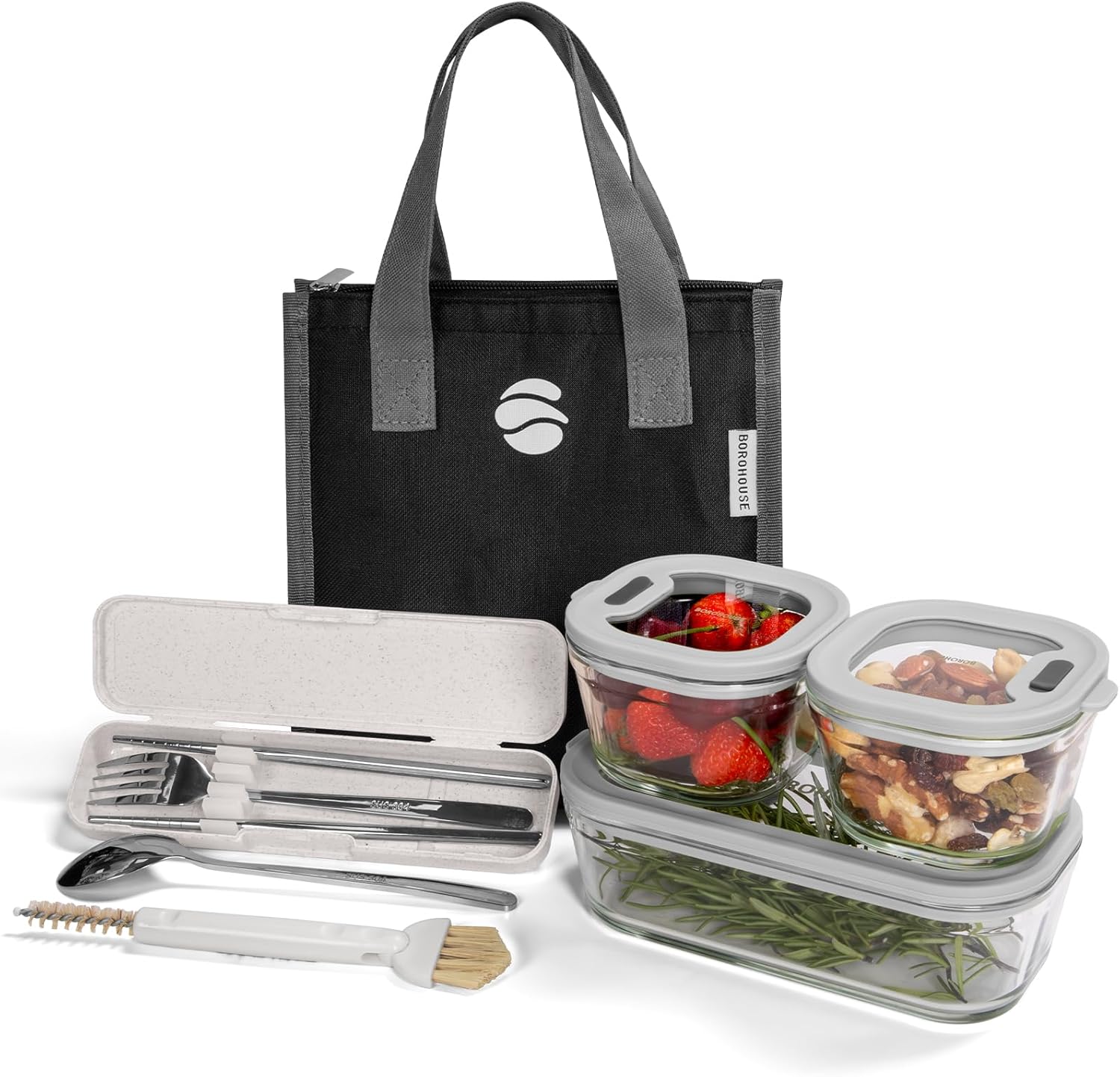 BOROHOUSEの最大の差別化ポイントは、「高品質な耐熱ガラス容器+持ち運び用品のオールインワン構成」というパッケージ設計にあります。