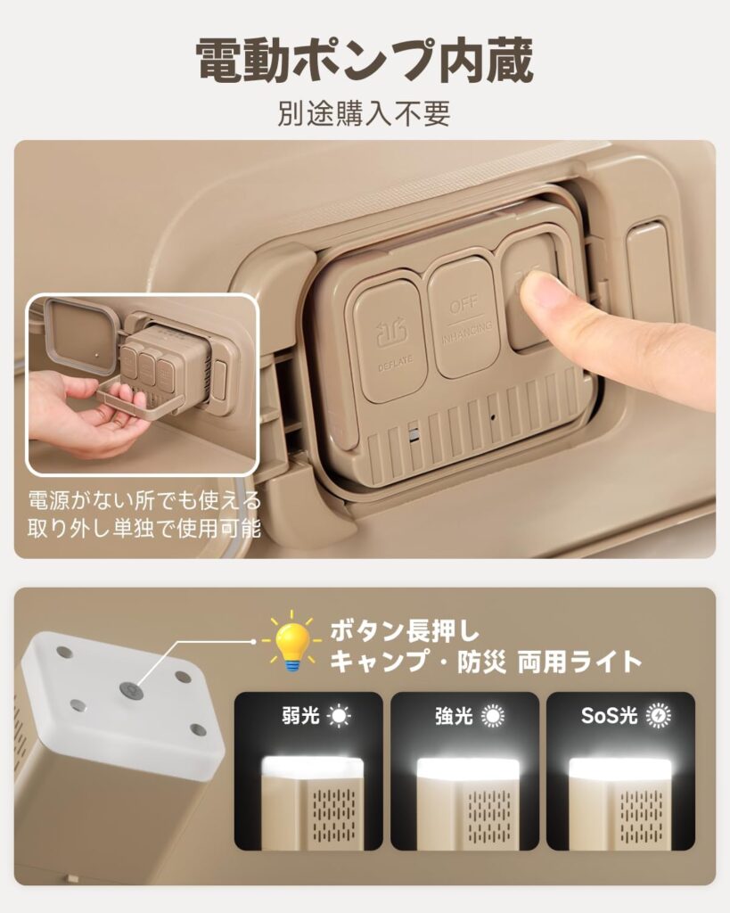 LXD100の最大の特徴は、ユーザーが抱く「設営の面倒臭さ」を完全に払拭している点にあります。市販の安価なエアーベッドにありがちな、足踏みポンプでの重労働は一切不要です。スイッチ一つで完成する利便性は、忙しい現代人の時間を守る強力な武器となります。
