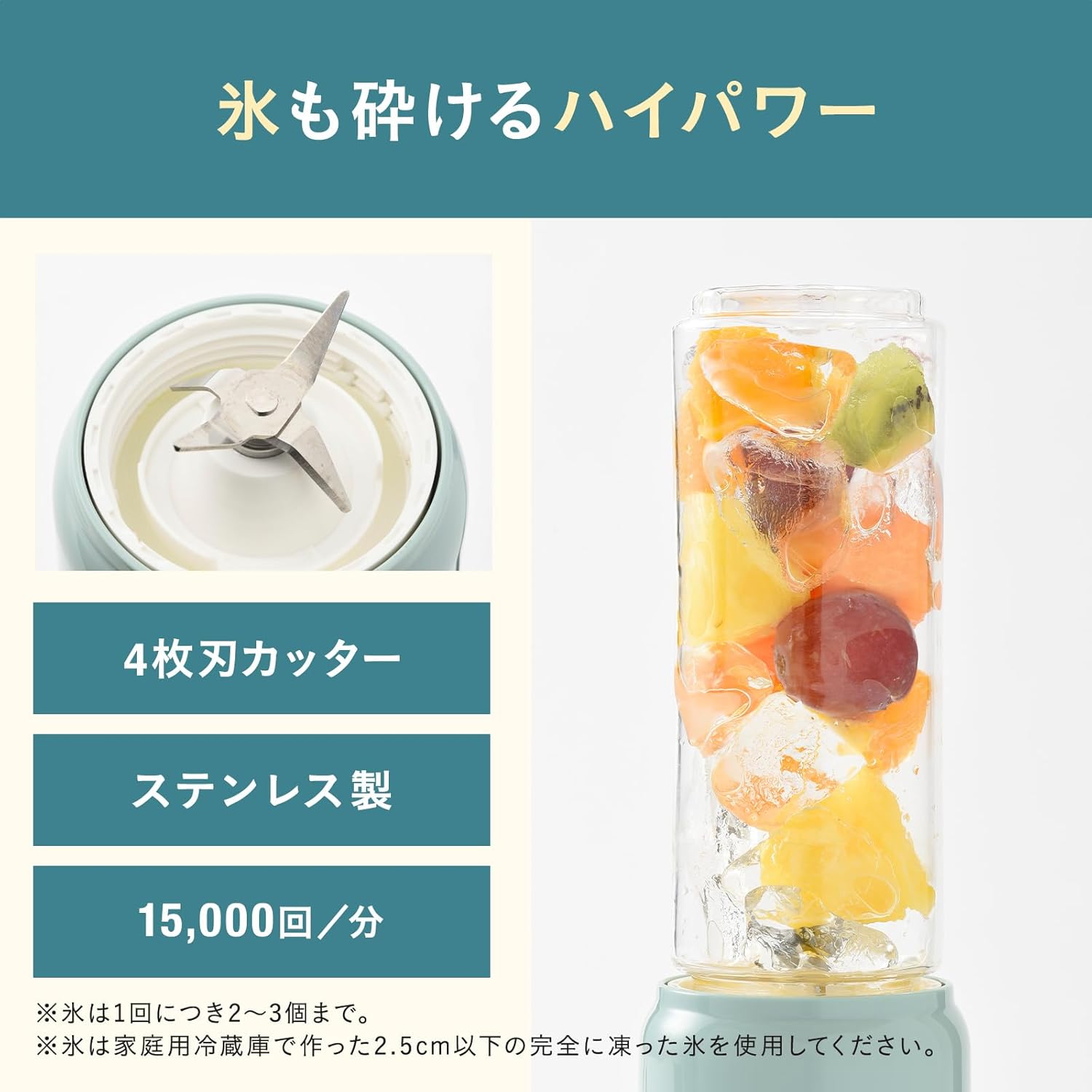 「消費電力が150Wなので、氷や凍った大きな果物を砕くには少しパワー不足を感じることがあります。」