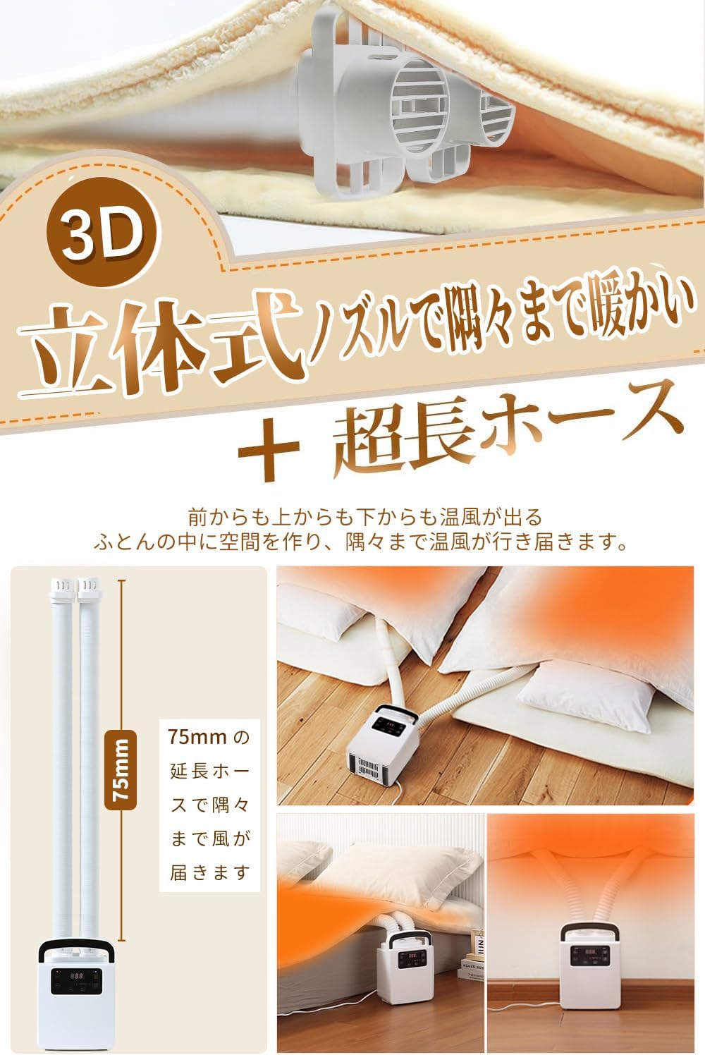 また、幅18.6cm×高さ26.8cmというコンパクトサイズ(A4用紙よりも底面積が小さい)でありながら、ツインノズルを採用している点も見逃せません 。これにより、夫婦の布団を2組同時に温めたり、1組の布団を足元と胸元の両方から攻めてムラなく乾燥させたりと、ユーザーのライフスタイルに合わせた柔軟な運用が可能です。まさに「時は金なり」を体現する、タイパ(タイムパフォーマンス)に優れた一台と言えます。​