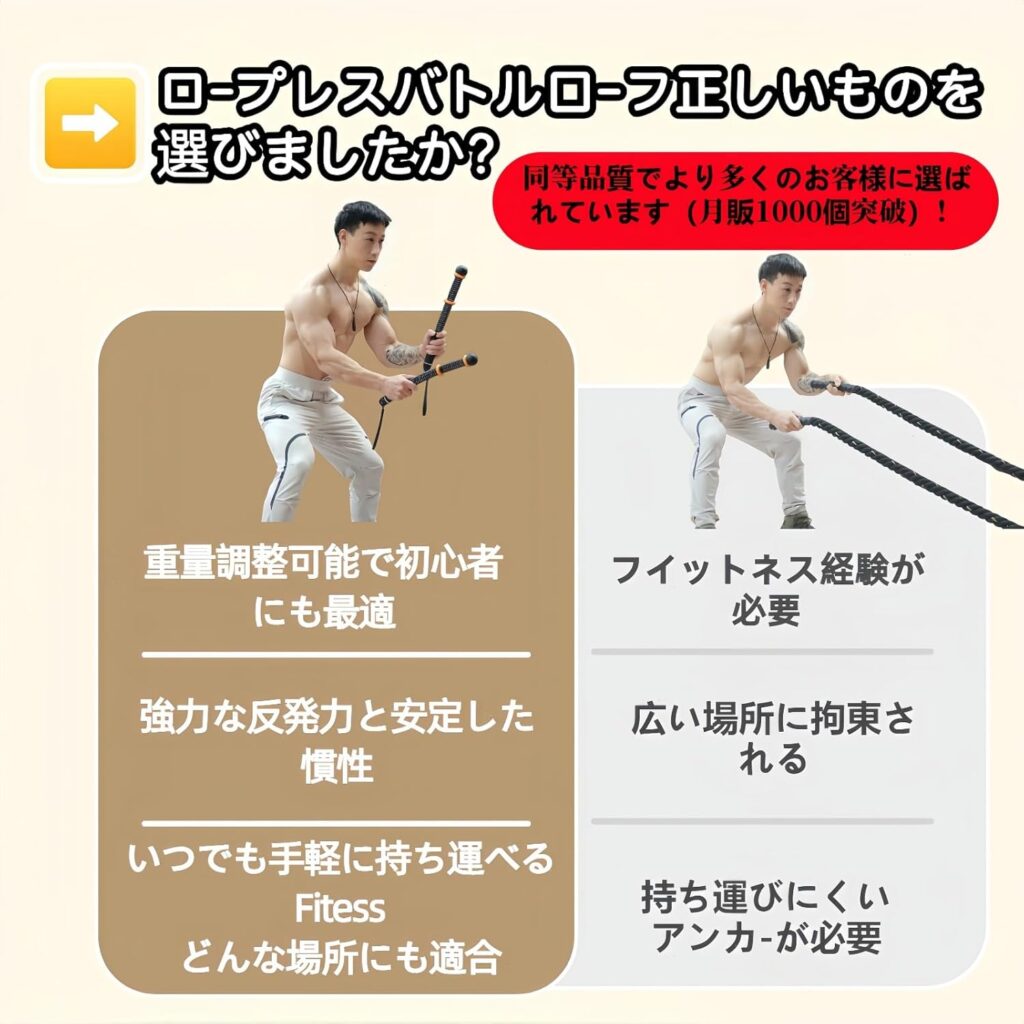 この商品の最大の強みは、「空間の制約からの解放」です。本来、バトルロープは最低でも3メートル以上の奥行きと防音環境が必要なハードルの高い種目でした。しかし、本製品はウェイトの遠心力を利用することで、わずか「両腕を広げられるスペース」さえあれば、ジム同等の高強度インターバルトレーニング(HIIT)を可能にします。また、1.3kgという絶妙な重量設定は、初心者には重すぎず、上級者には回数で負荷を調整できるスイートスポットを突いています。TDR(熱可塑性ゴム)を採用したウェイト部は耐久性が高く、万が一床に接触しても傷をつけにくい点も、日本の住宅事情に完全にマッチした改善点と言えます。
