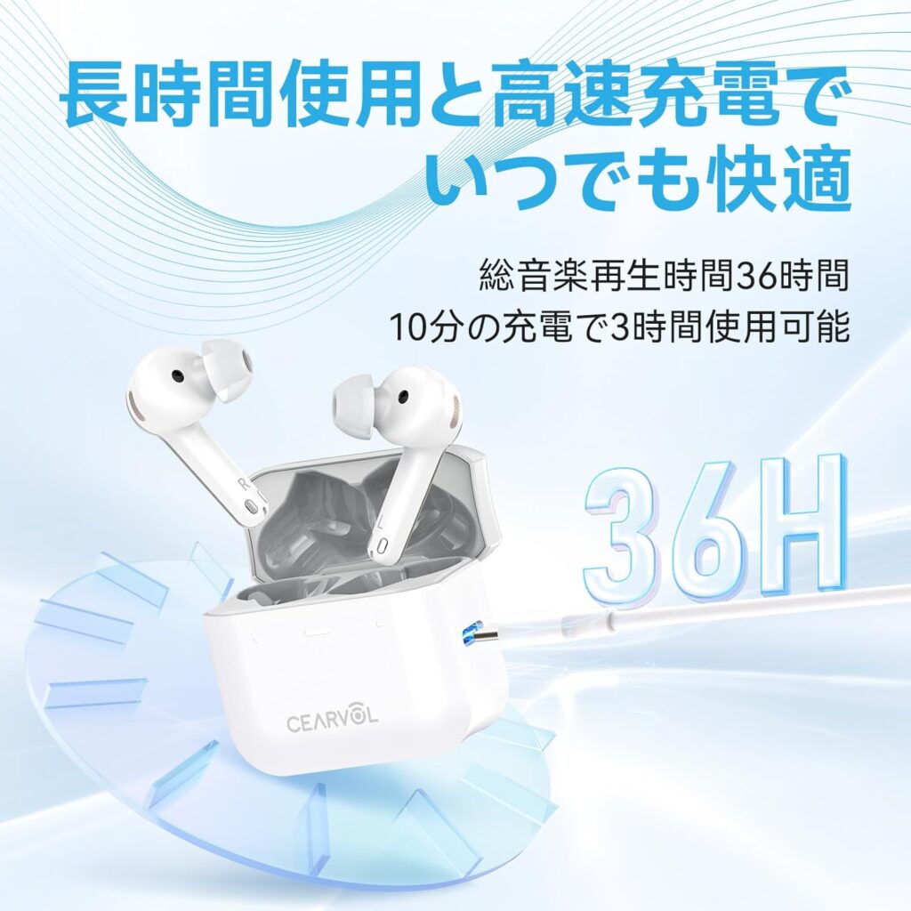 そして、バッテリー性能の優秀さも見逃せません。最大36時間の連続使用(充電ケース併用)が可能であり、さらに10分間の急速充電で約3時間使用できる機能は、忙しい現代人の生活リズムに完全に適合しています。これにより、充電切れの不安から解放され、終日安心して使用することができます。
