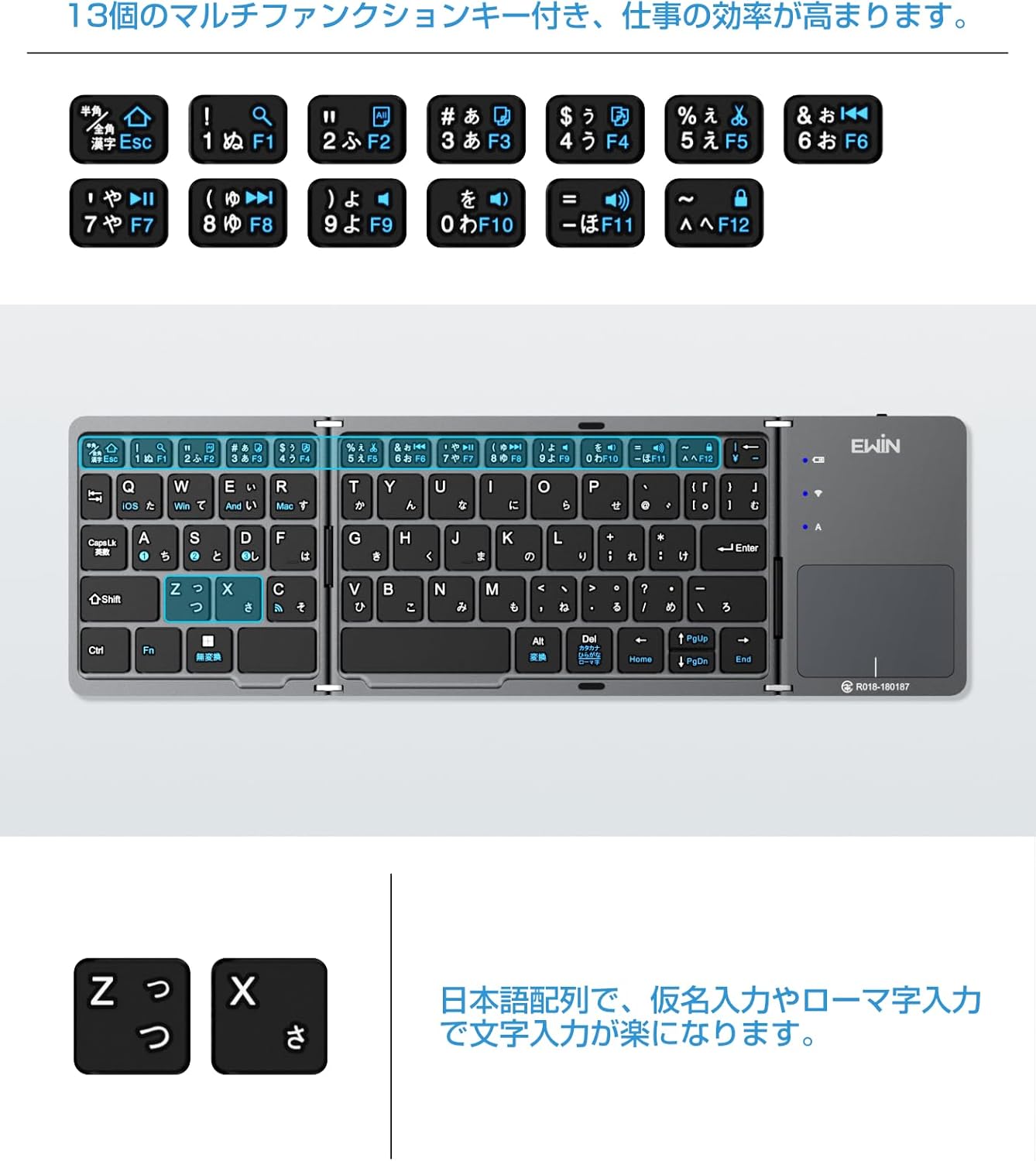 • 特徴: タッチパッド内蔵、折りたたみ式