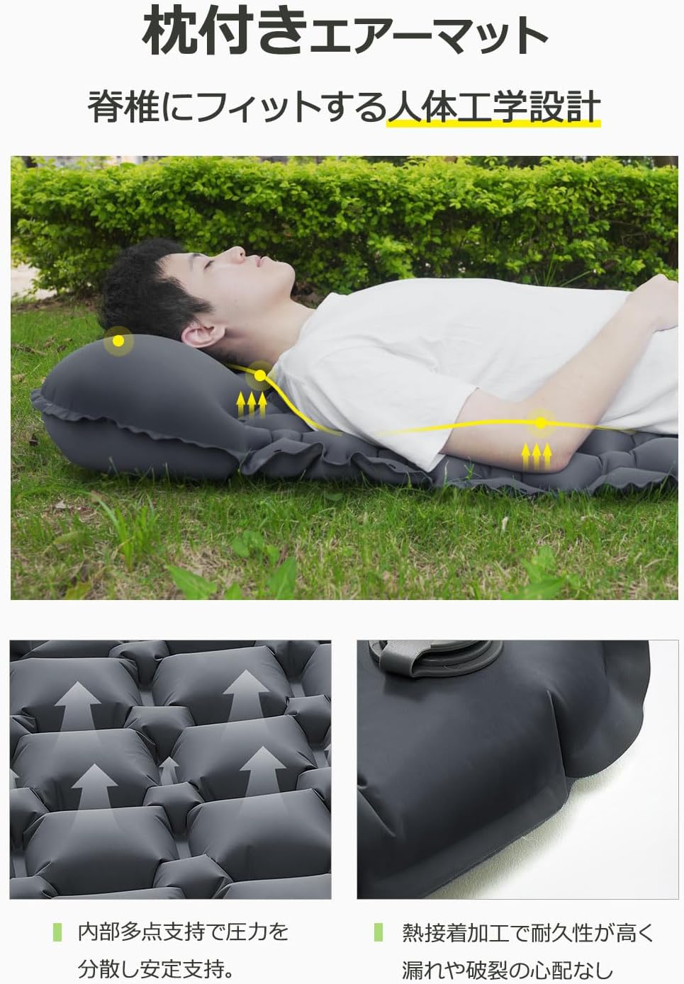 凹凸設計による圧力分散構造も見逃せません。仰向けでも横向きでも体圧が均等に分散されるため、長時間寝ていても体が痛くなりにくい設計です。枕が一体化している点も、荷物を減らしたいキャンパーにとっては実用的な工夫と言えます。