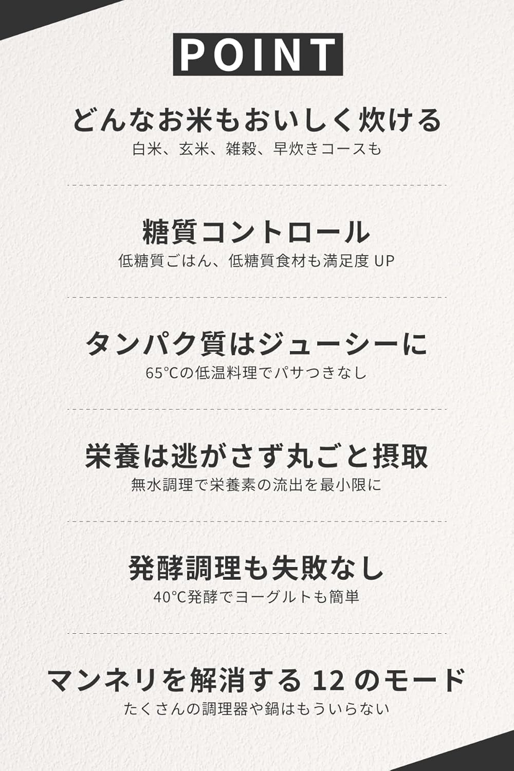 - 「糖質カットでも普通に美味しく炊けるし、サラダチキンなどの低温調理も放置で作れるのが便利」