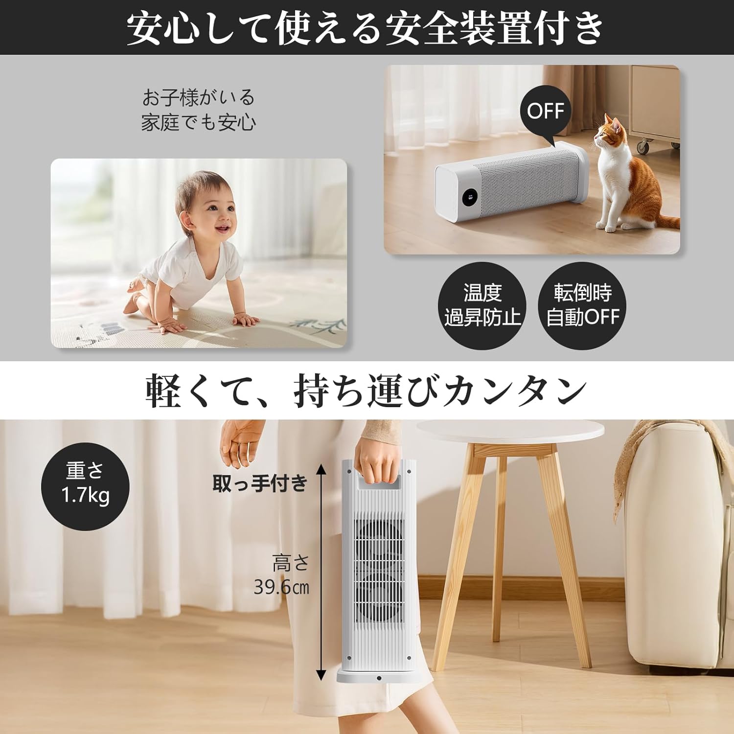 「思ったより軽量で、リビングや寝室など、使いたい場所に気軽に持ち運べるのが良いですね。メイン暖房の補助として大活躍です。」