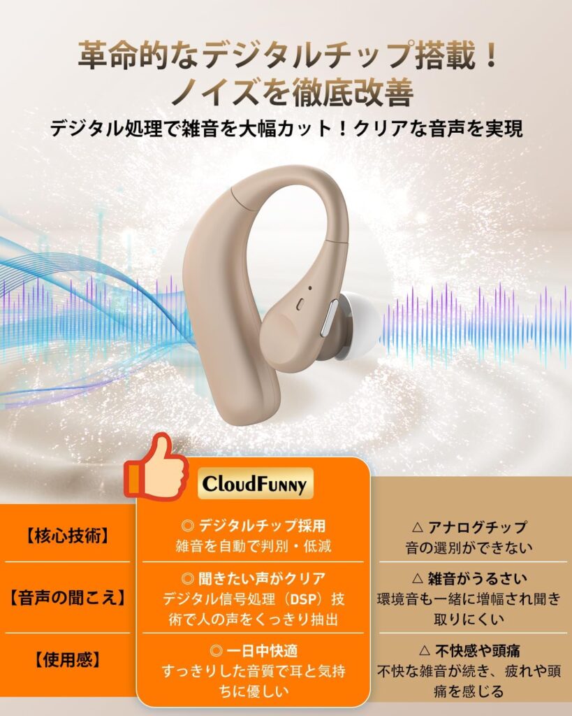 Amazonなどで競合する、他の中国系ブランド(例えばJinghaoやVibeなど)と比較した場合、CloudFunnyはより「見た目」と「使い勝手」に振った戦略をとっています。他社が補聴器に近い形状を追求する中で、ZR-H718-3は完全ワイヤレスイヤホン型をベースにしており、装着時の心理的な抵抗感を最小限に抑えています。