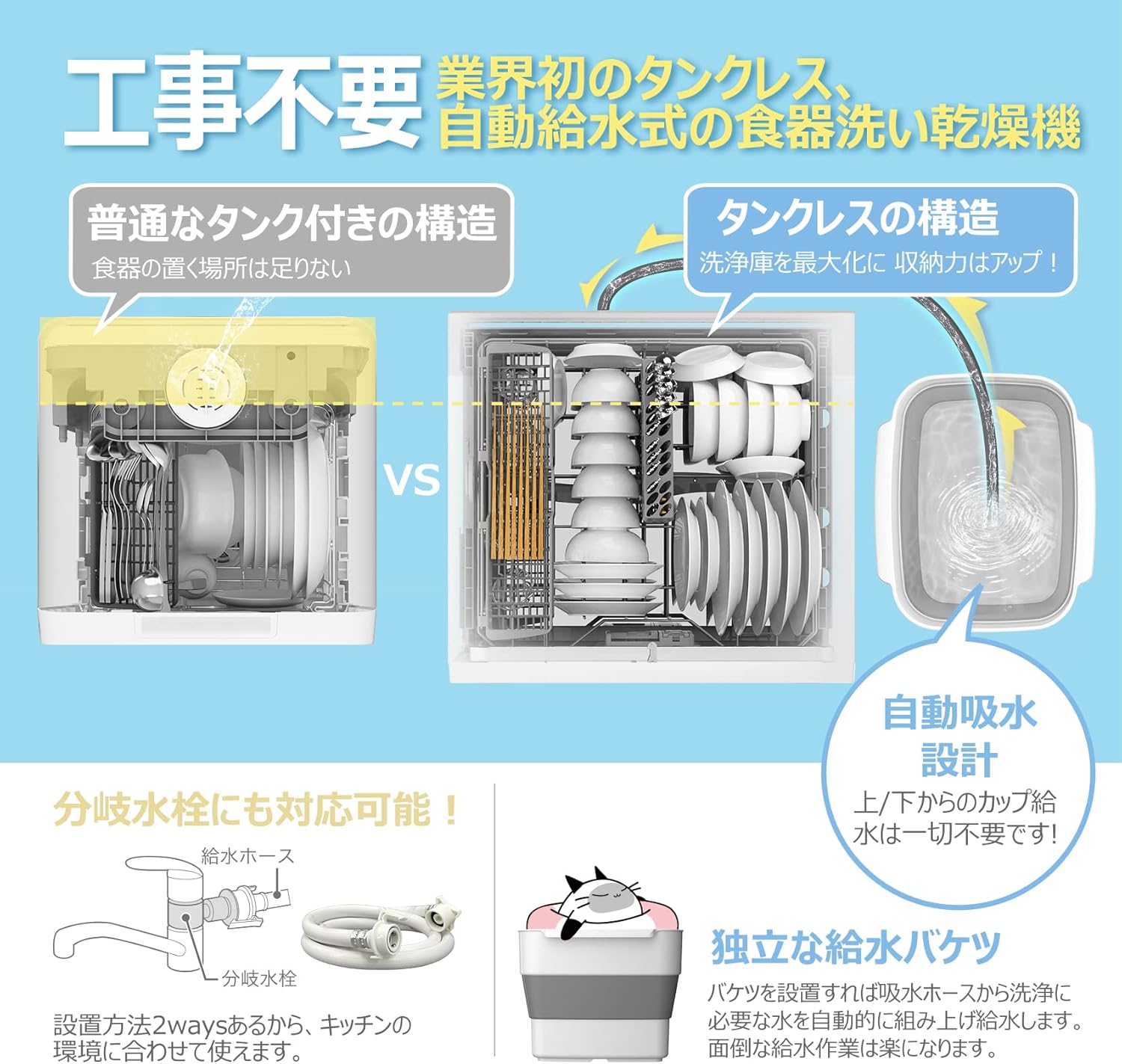 「賃貸で分岐水栓の工事ができなかったのですが、タンク式として使えるこのモデルのおかげで、念願の食洗機デビューができました」