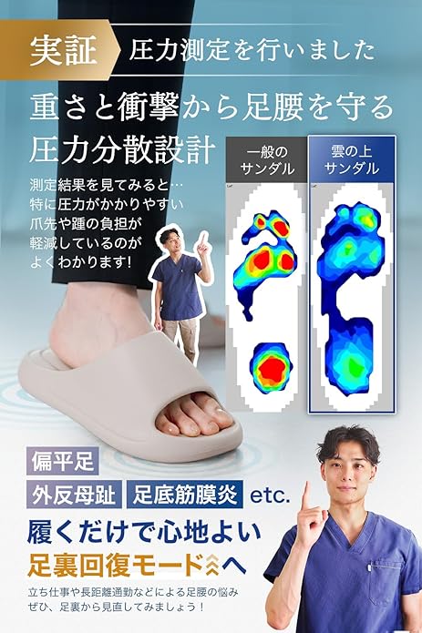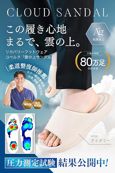 このサンダルの最大の武器は、科学的に証明された「圧倒的な解放感」にあります。 単なる厚底サンダルは世の中に溢れていますが、sandal-001は圧力分散試験をクリアしており、足裏の特定の場所に負担が集中しないよう設計されています。 例えば、長時間キッチンに立つ主婦の方や、立ち仕事で足裏がカチカチに固まっている方にとって、この「雲の上を歩くような感覚」は、ただの履物以上の価値を提供します。 さらに、Ag+銀イオンによる抗菌防臭機能が標準装備されているため、夏場の不快なムレやニオイ問題にも先回りして対策がなされています。 室内履きとしての静音性も高く、マンション住まいの方でも下の階を気にせず歩けるなど、日本の住環境に徹底的に寄り添った名作です。