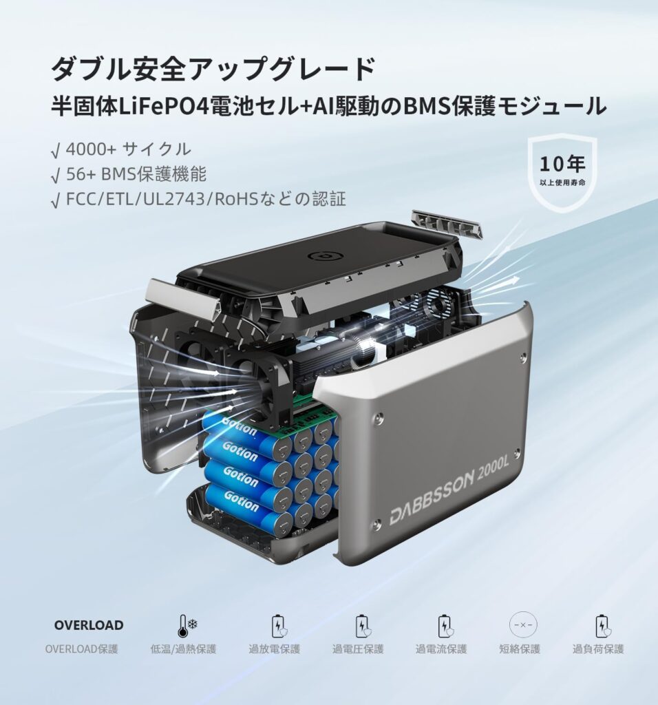 同じ「リン酸リチウム」系の電池を搭載しながら、Dabbsson「2000L」は18.6kgという軽量化を実現しています。これは、バッテリーセルの配置や筐体設計において、Dabbssonが高い技術力を持っていることの証明でもあります。「安全な電池がいいけれど、重すぎるのは困る」という、これまでBLUETTI購入を躊躇していた層の悩みを解決する回答が、Dabbsson「2000L」なのです。