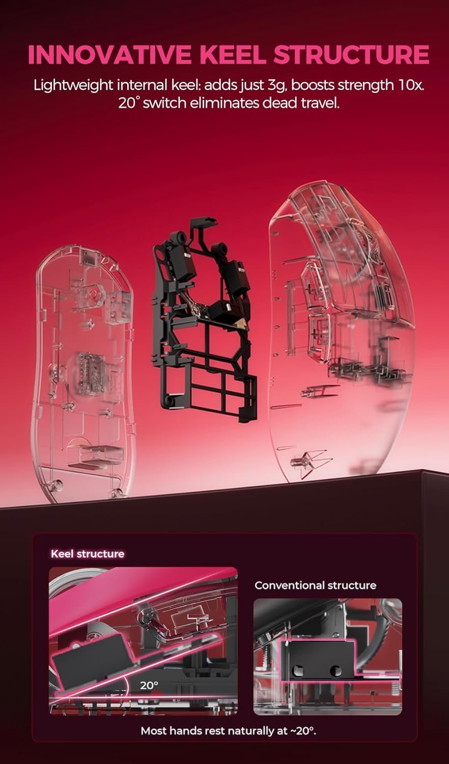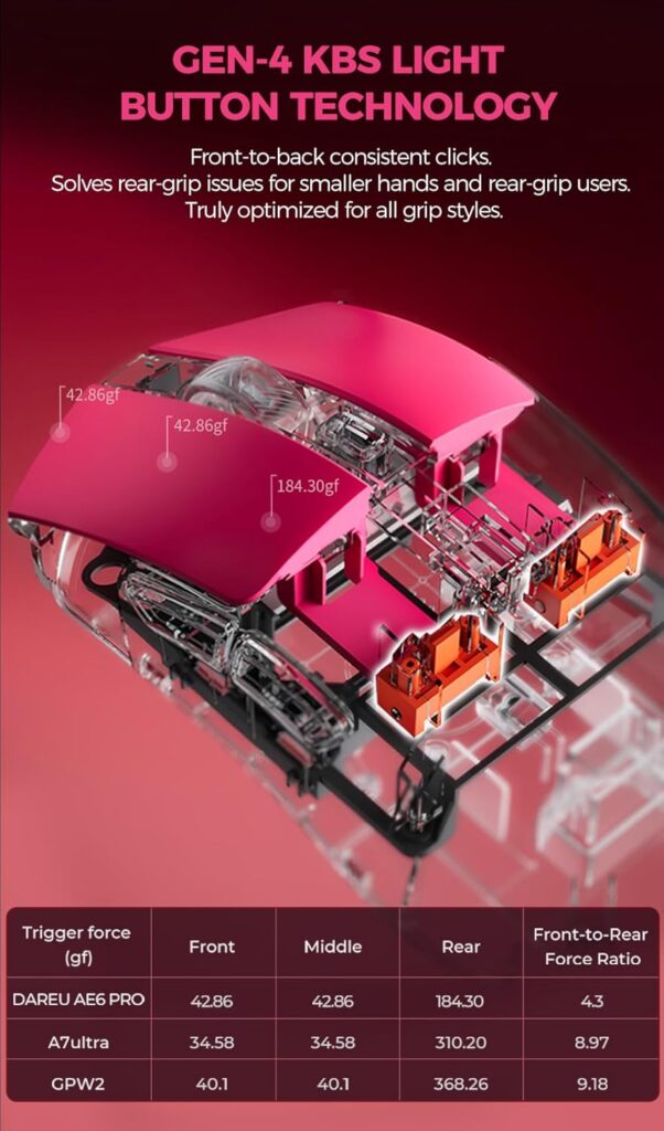 また、単なる軽量化競争に終止符を打つ「龍骨フレーム」構造は革新的です。3gの重量増と引き換えに得られる圧倒的な剛性は、プロシーンで求められる「信頼性」を担保します。さらに、4世代にわたって改良された「KBS Light」ボタン技術は、マウスの持ち方を問わず、常に一定のクリック感を提供するため、プレイスタイルを変えても違和感なく使用できます。これに真の8Kポーリングレートが加わることで、AE6 PRO-MAは「価格破壊」という言葉では片付けられない、本物のハイエンド機へと昇華されています。