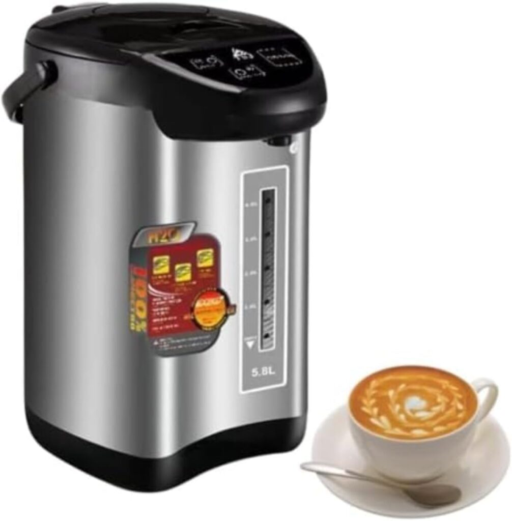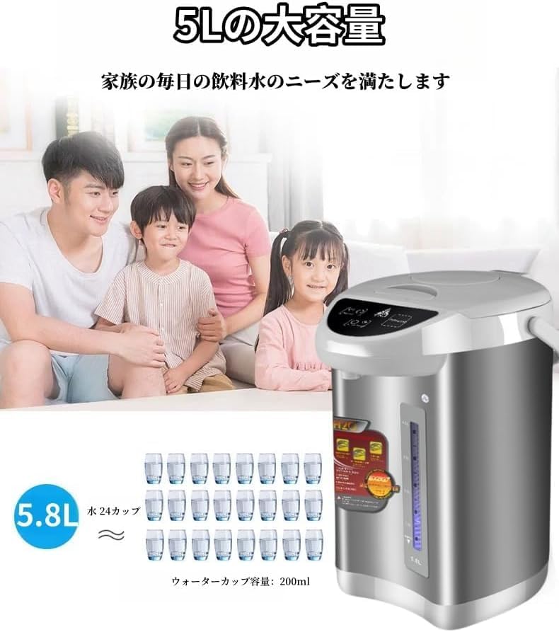 この電気ポットの最大の魅力は、なんといっても5.8Lという圧倒的な大容量です。一般的な家庭用ポットが2〜3L程度である中、この容量はオフィスや大家族、または来客が多い家庭にとって、まさに「かゆいところに手が届く」存在と言えるでしょう。一度沸かせば、朝のコーヒーから日中のティータイム、夕食の準備まで、お湯切れを心配することなく一日中たっぷりと使えます。