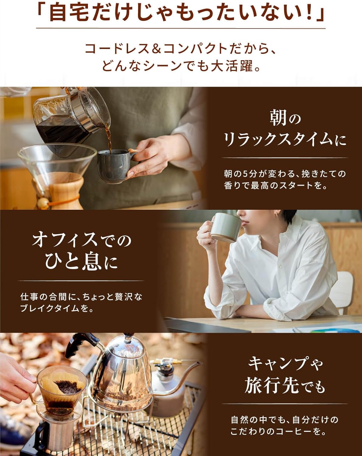 2. 「コードレスなのでキャンプに持ち出しています。焚き火を見ながら、電源のない場所で挽きたてのコーヒーを飲めるのは最高の贅沢です」