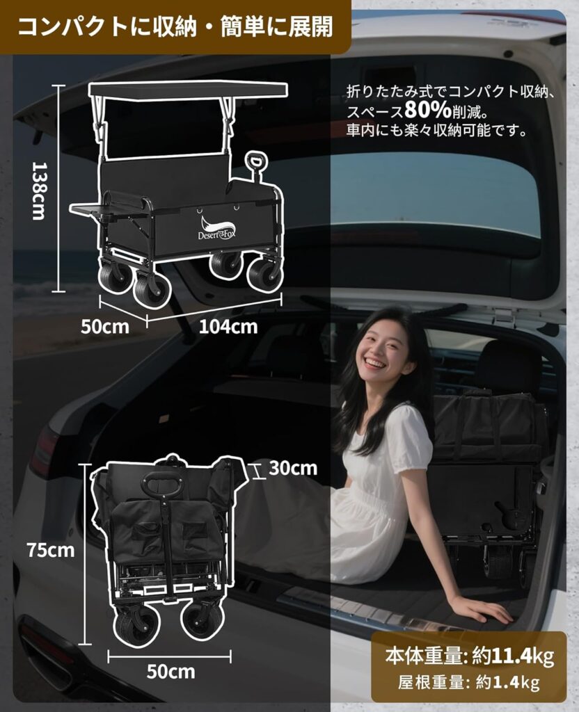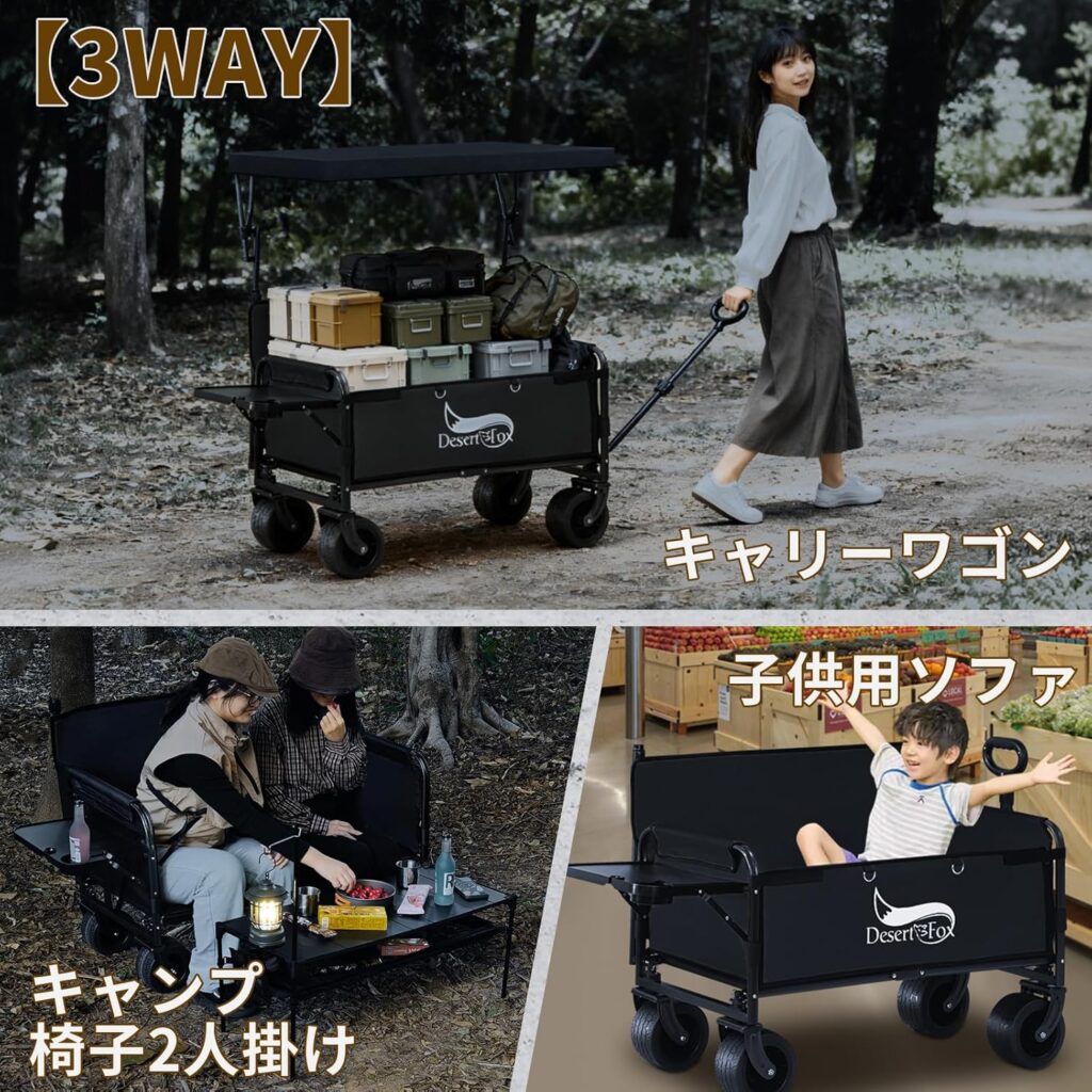 次に、日本発のブランドとして急速にシェアを伸ばしているWAQと比較してみましょう。WAQのキャリーワゴンもワイドタイヤを採用しており、DesertFoxと非常に近いスペックを持っています。WAQの強みは、日本メーカーならではのアフターサポートの充実と、落ち着いたカラーバリエーションにあります。対してDesertFoxは、WAQよりもさらに数千円ほど安価に設定されていることが多く、「同等のスペックをいかに安く手に入れるか」という一点において非常に強力です。