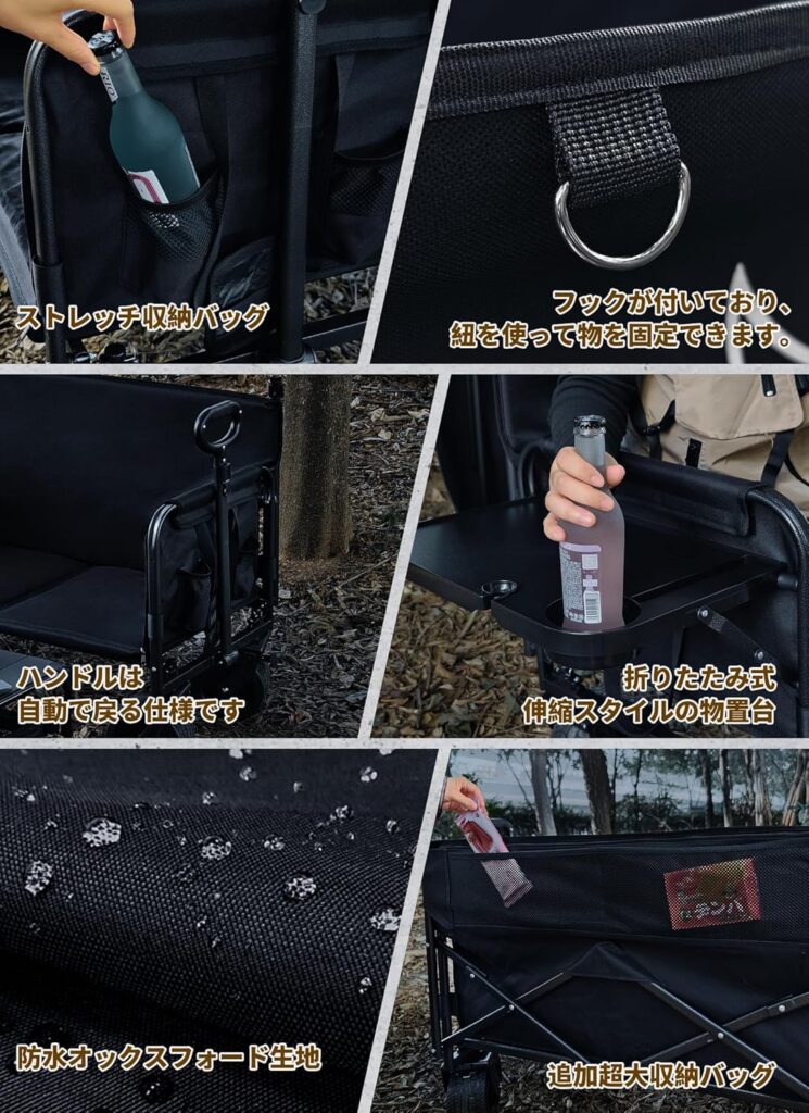 さらに、耐荷重150kgというスペックは、単に重いものが運べるというだけでなく、製品自体の「耐久寿命」に直結しています。余裕を持った設計により、限界ギリギリで使うことが少ないため、長期間愛用してもフレームのガタつきが出にくい構造になっています。600Dの厚手生地は、鋭利なキャンプ道具が当たっても破れにくく、タフな環境でこそ輝く一台と言えるでしょう。
