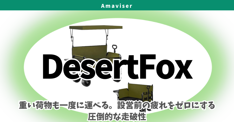 DesertFox(デザートフォックス)は、主にAmazonなどのECモールを中心に展開しているアウトドア用品ブランドです。運営の実体は中国の拠点を中心としたメーカーであり、テント、アウトドアチェア、コット、そして今回のメインであるキャリーワゴンなど、多岐にわたるキャンプギアを製造・販売しています。
