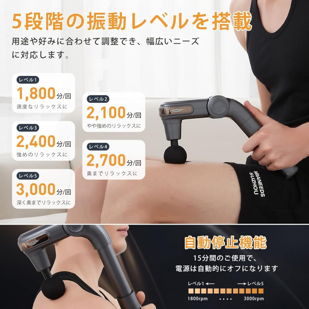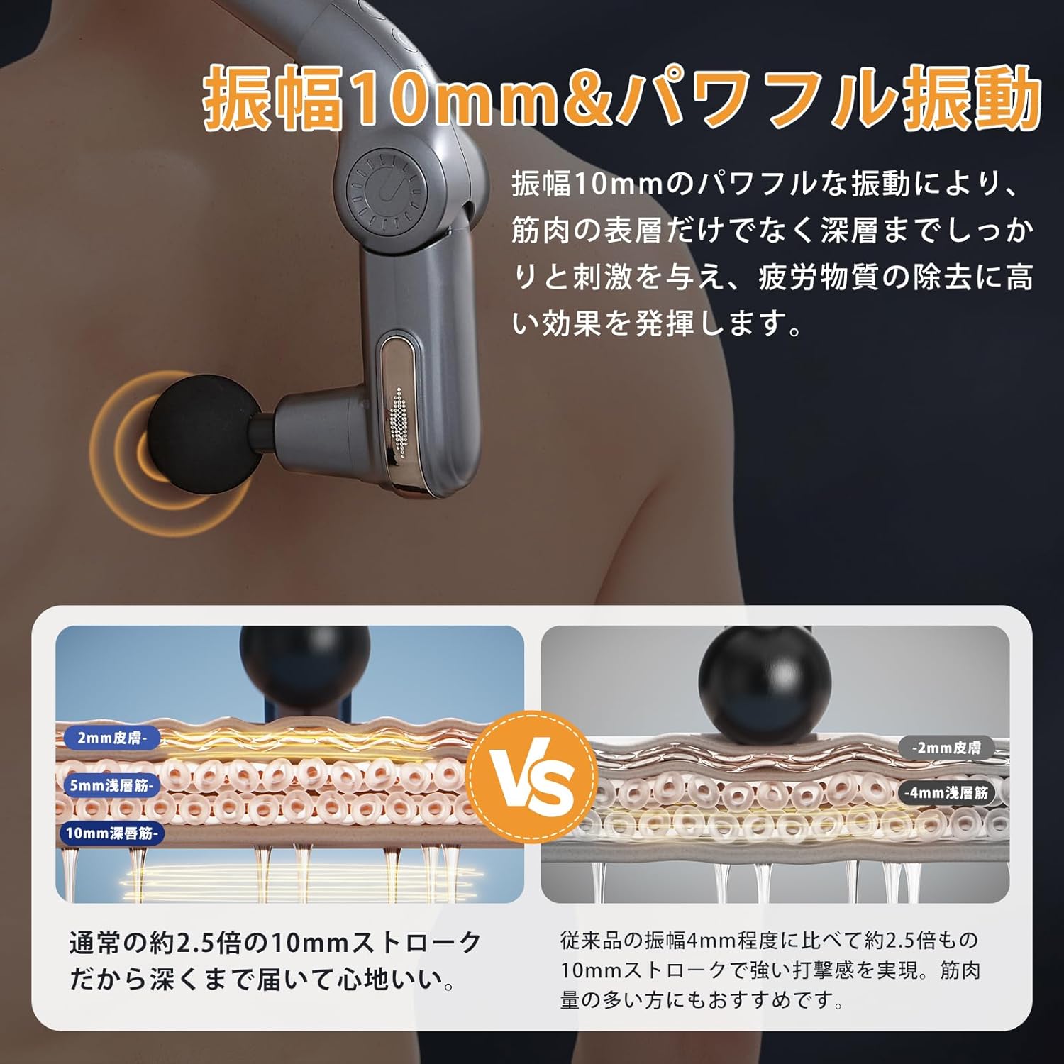 まず、「0.48キログラム」という驚異的な軽量性は、単なる持ち運びのしやすさに留まりません。従来の製品は重さが1キログラム前後が主流であり、特に体の大きな部位、例えば「太もも」を長時間ケアする際には、本体の重さで腕が疲れてしまうという問題がありました。しかし、本製品は卵パック程度の重さで、どの角度からでも深部の筋肉にアプローチできるため、ユーザーはマッサージの継続を苦に感じません。これは、セルフケアにおける最も重要な成功要因です。
