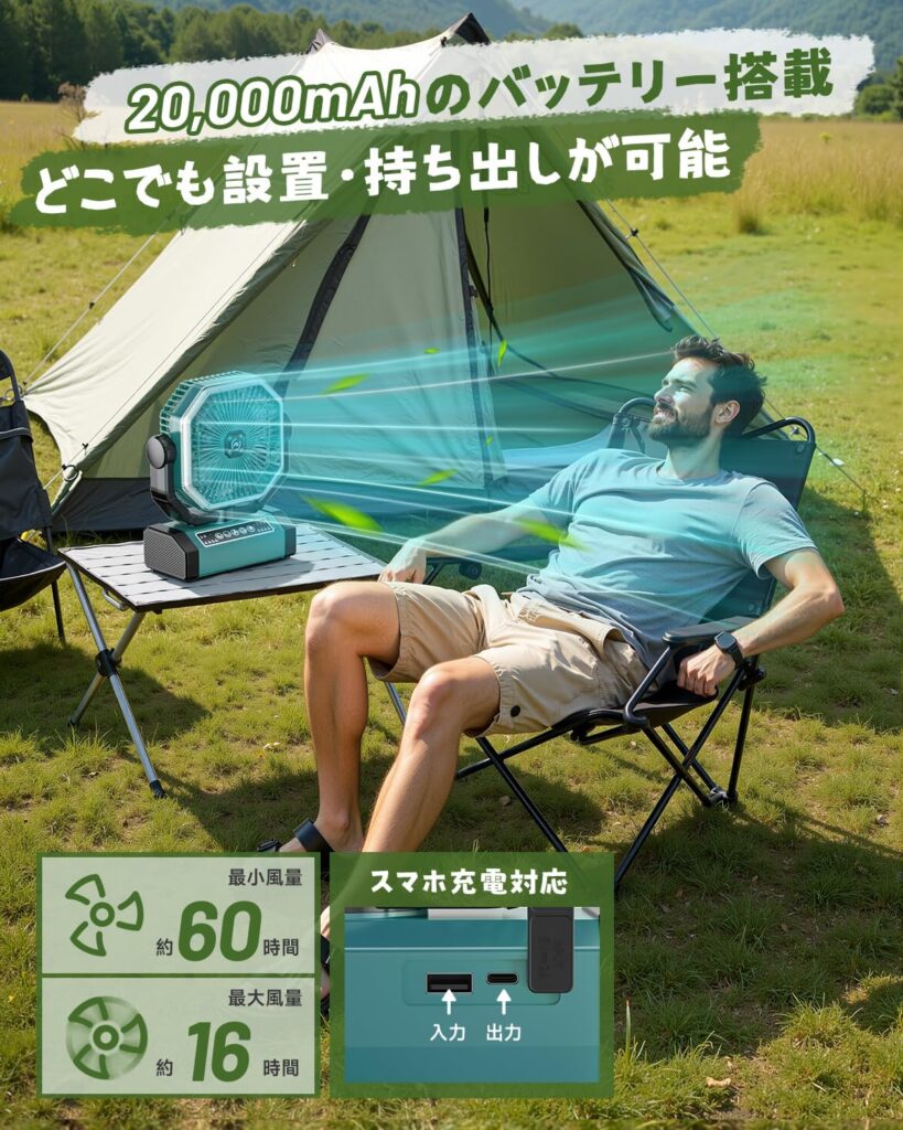 GYF01最大の武器は、20000mAhという圧倒的な容量のバッテリーです。最弱風量では最長60時間という連続稼働は、2泊3日のキャンプを余裕でカバーするうえ、モバイルバッテリーとしてスマートフォンにも給電できます。アウトドアでは電源が最大のボトルネックになることが多いですが、GYF01があれば「充電できなかったらどうしよう」という不安から解放されます。Type-C両方向対応という仕様も、現代のデバイス環境にぴたりと合致しています。