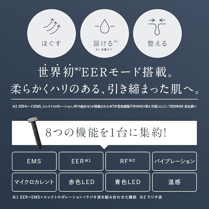 日本で初めてEMS、エレクトロポレーション、ラジオ波を組み合わせた「EER」という独自機能を搭載し、「ほぐす・届ける・整える」の3ステップで、まるでサロンのような本格ケアを自宅で、しかも短時間で実現します。