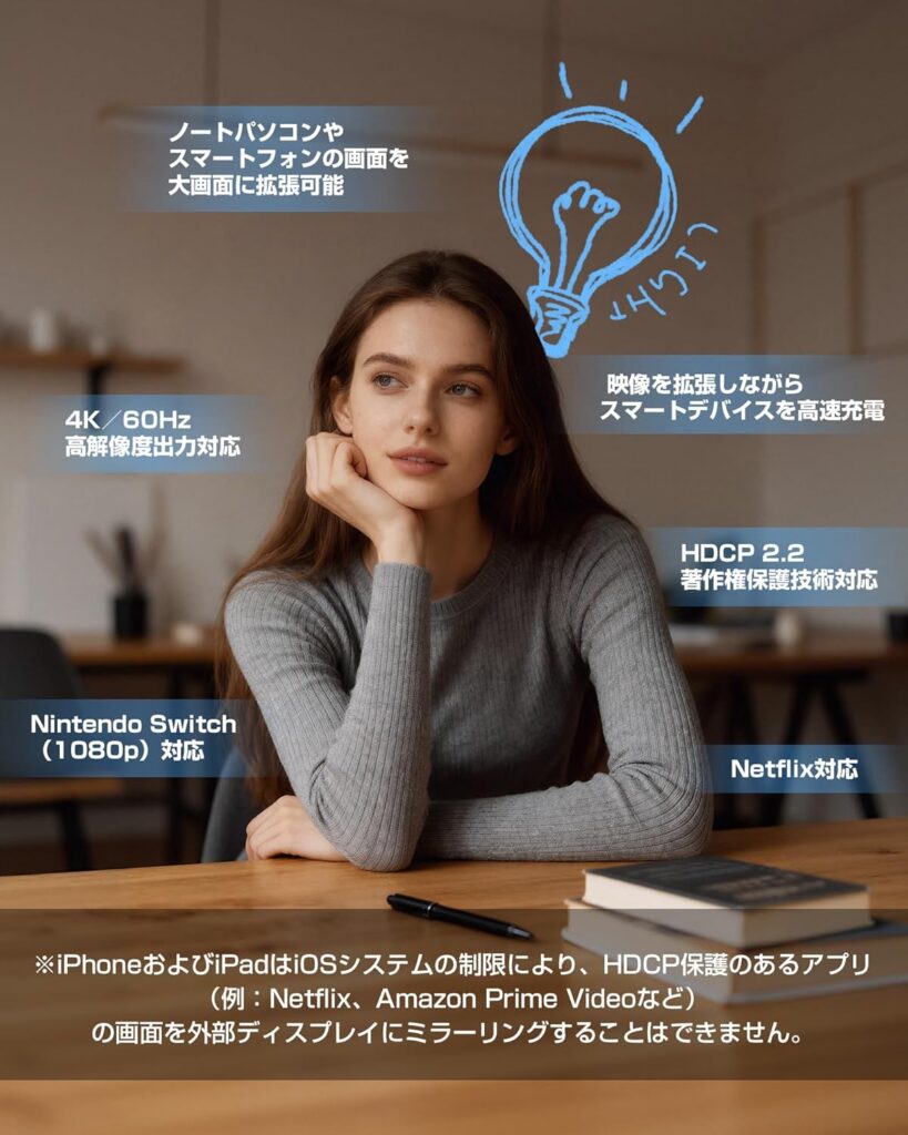 ただし、解像度やフレームレートの明確な仕様開示がない点は、他メーカーと比較して明らかな弱点です。Anker、ELECOM、MacLab.などの主要メーカーは、いずれも4K/60Hz対応を明記しており、ユーザーが安心して購入できる情報を提供しています。