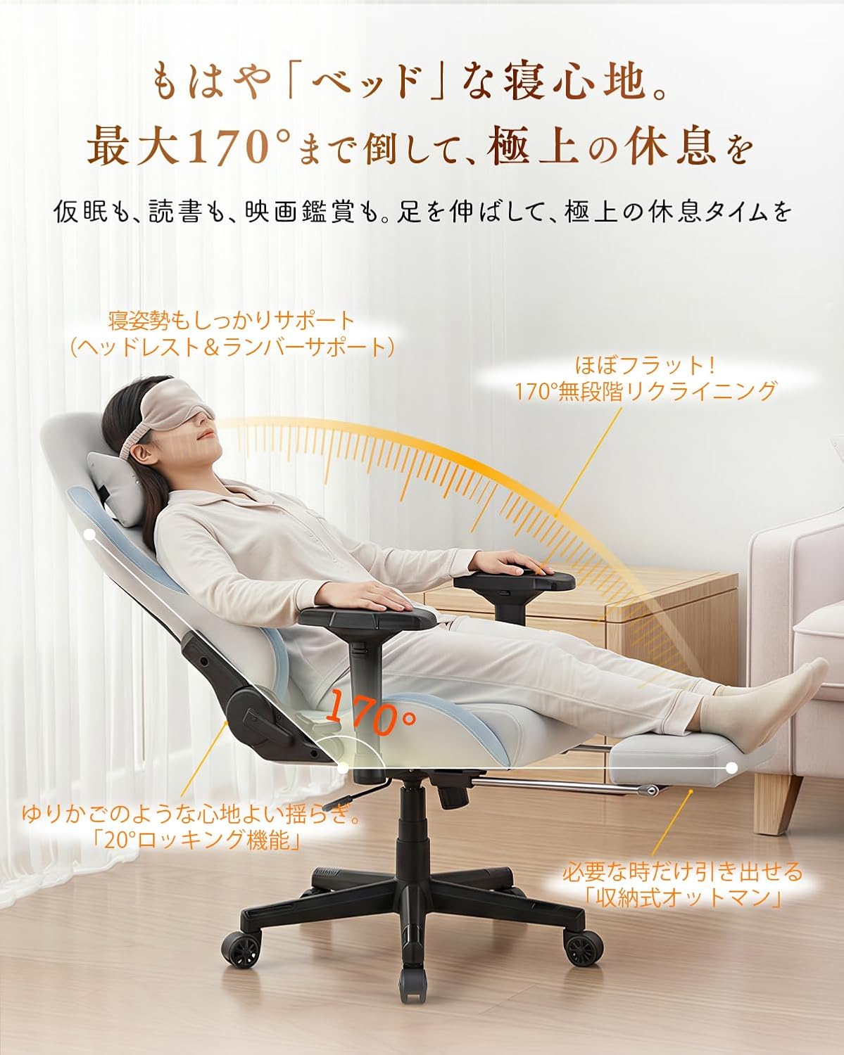 最大170度のリクライニングと収納式オットマンの組み合わせは、仮眠室の代わりとしても機能し、残業続きの現代人にとって貴重な休息空間を提供してくれます。